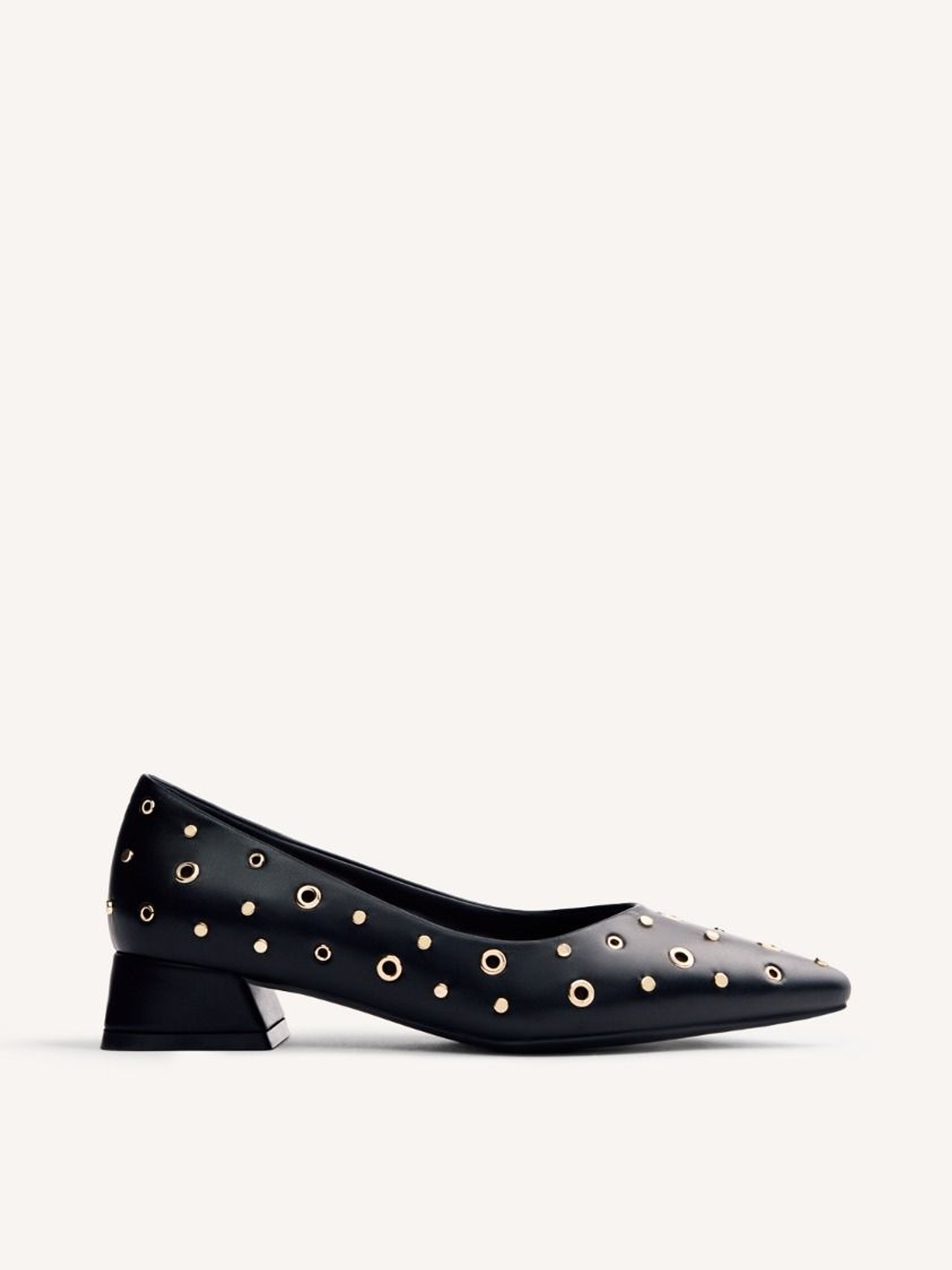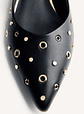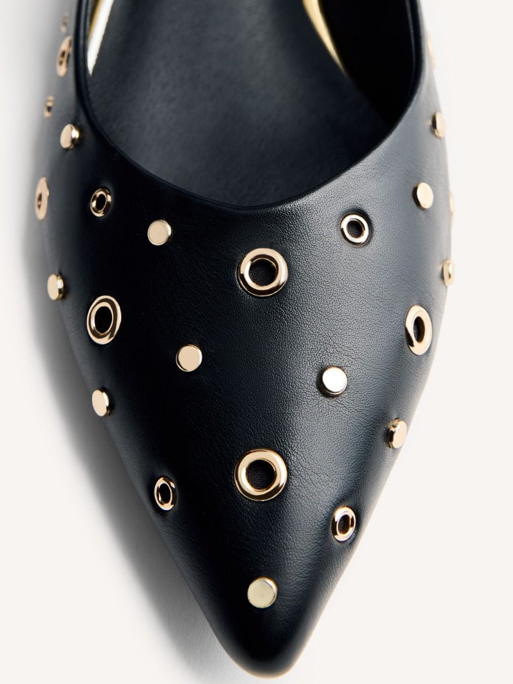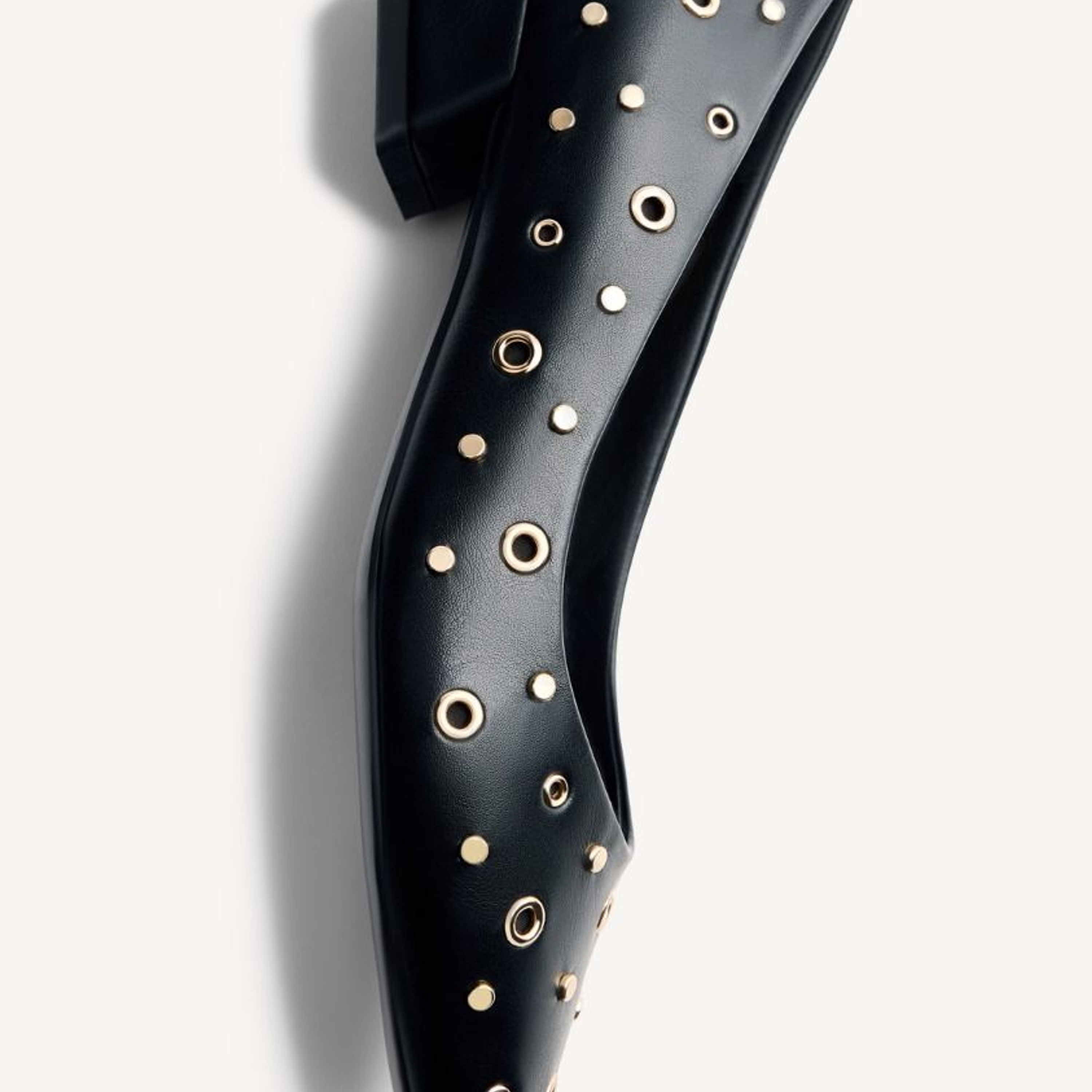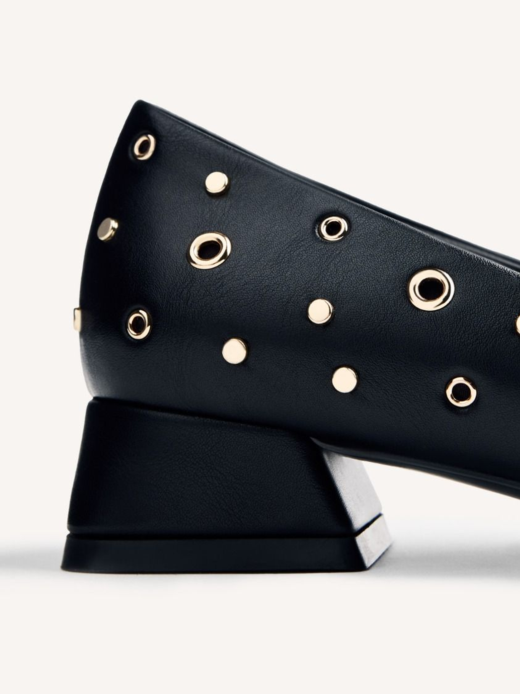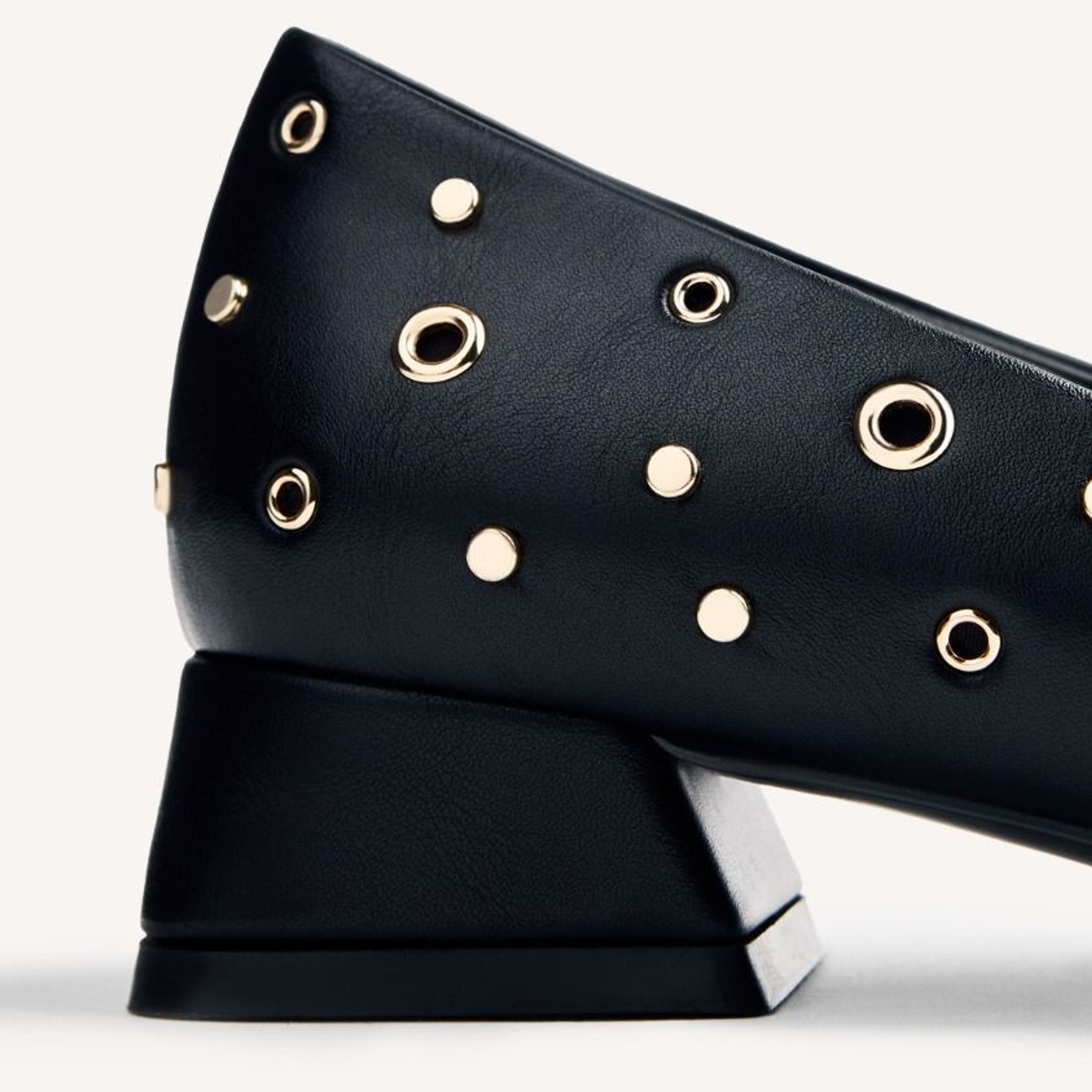 Sapatos com tachas e ilhós em acabamento dourado. Biqueira pontiaguda. Têm palmilha acolchoada e salto baixo em bloco com uma peça metálica no interior. Altura do salto: 3 cm. Cabedal e forro em poliuretano. Palmilha em couro. Sola de borracha flexível.