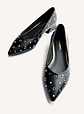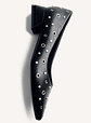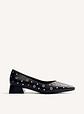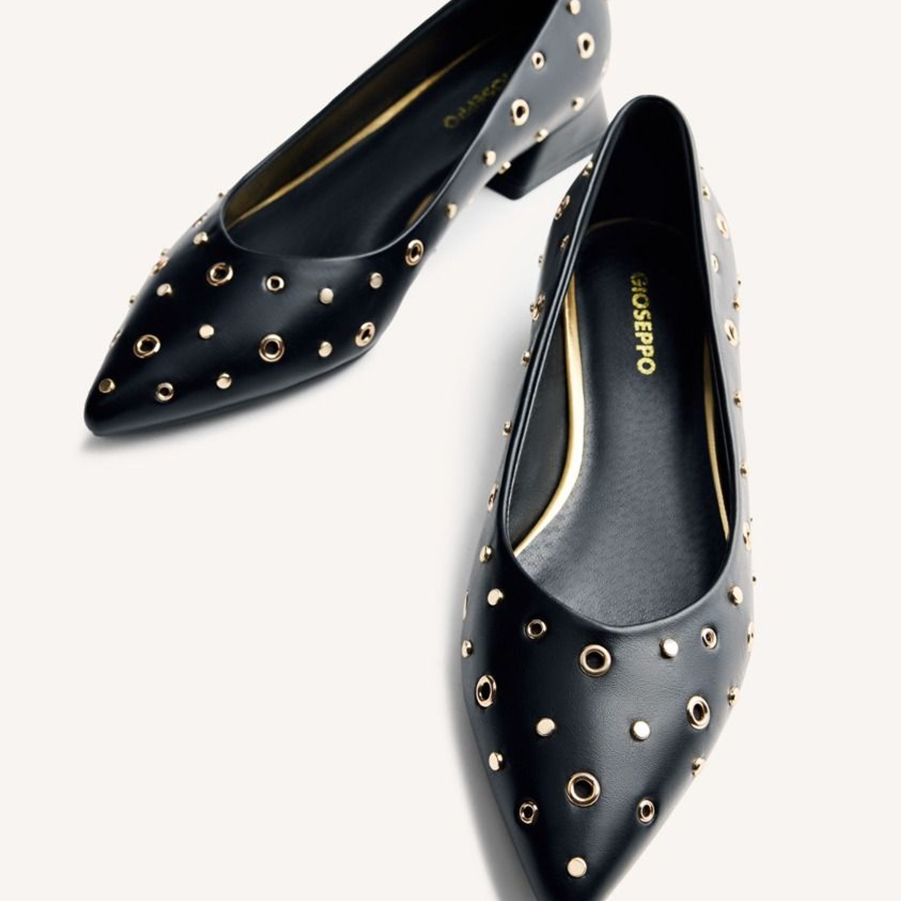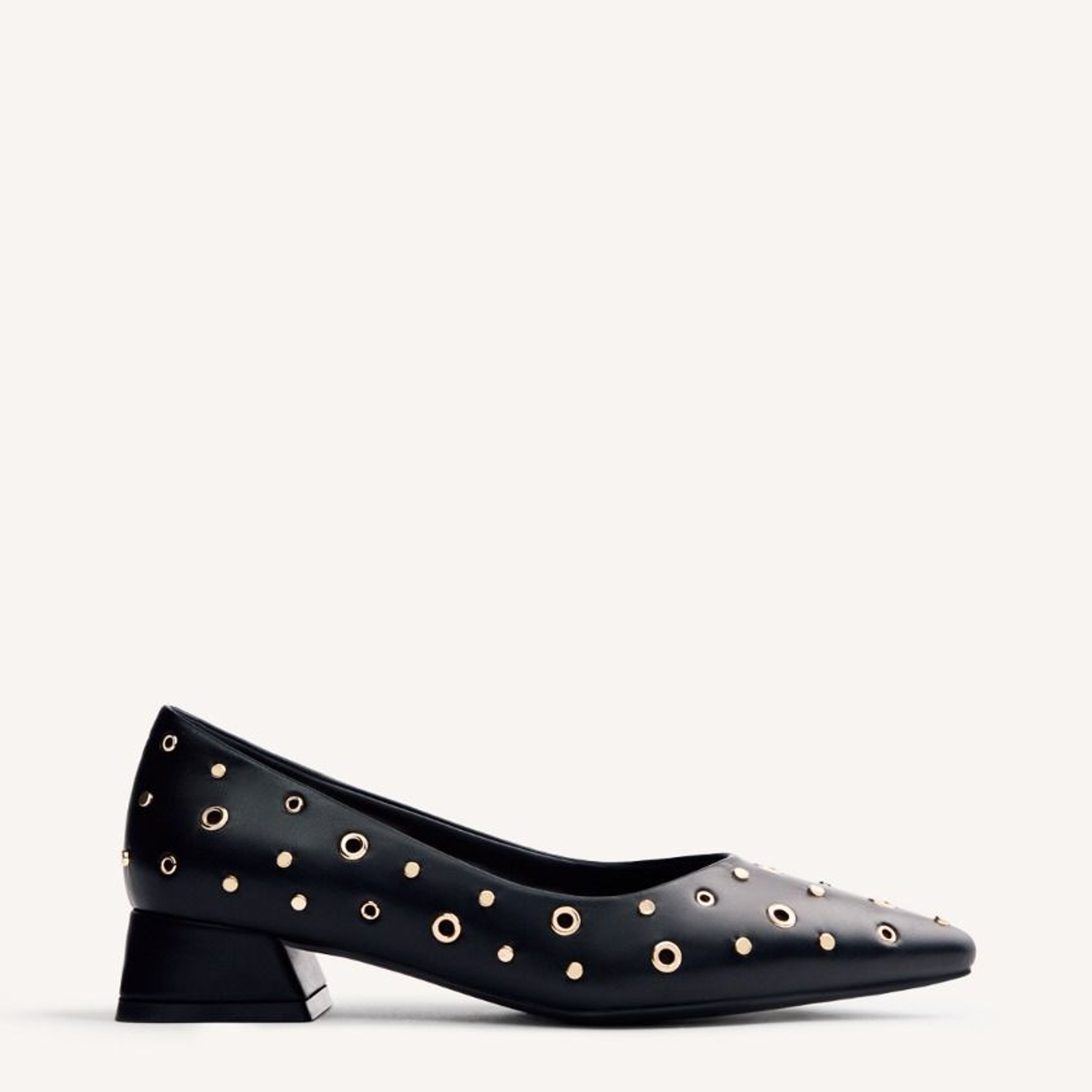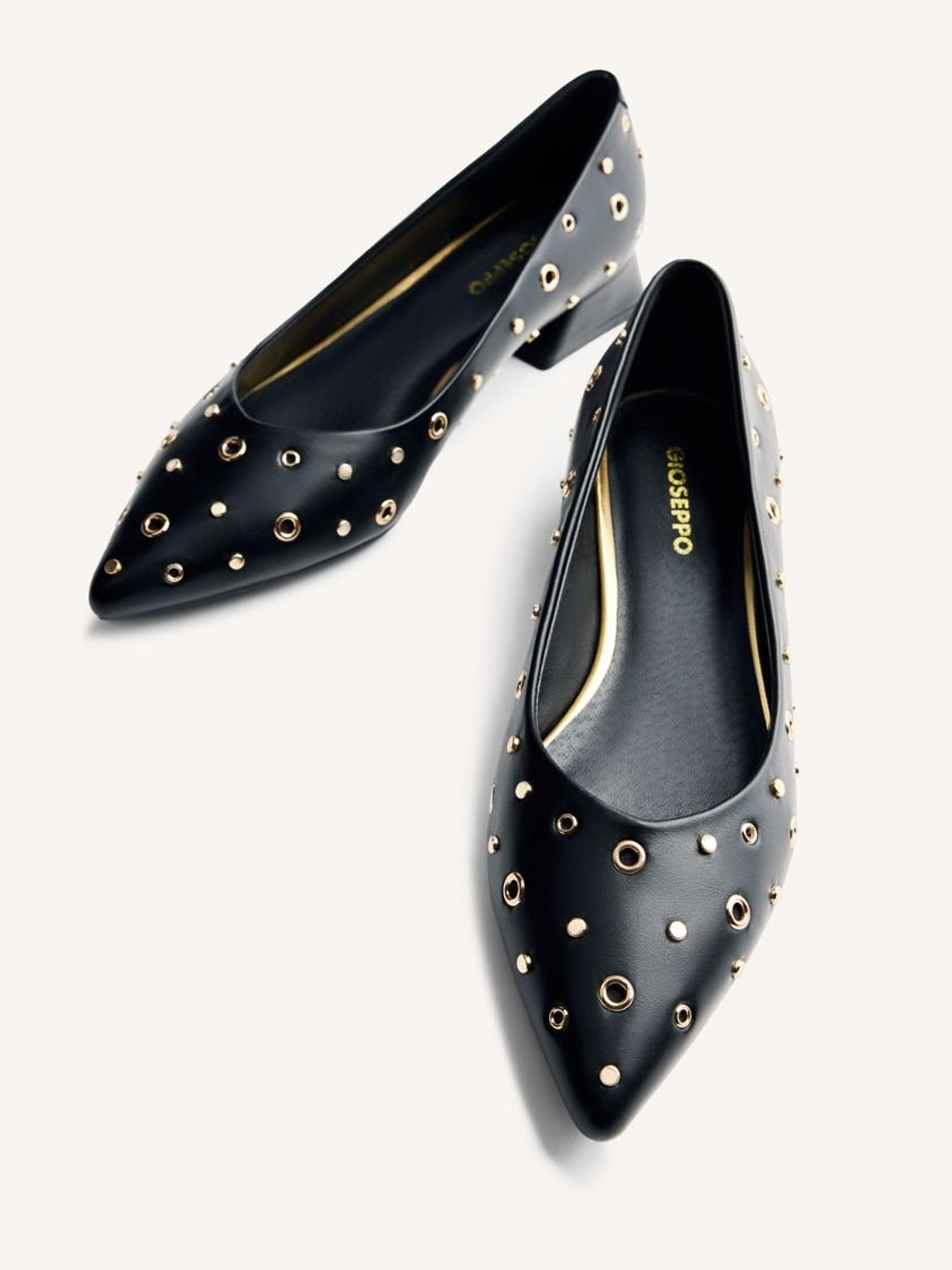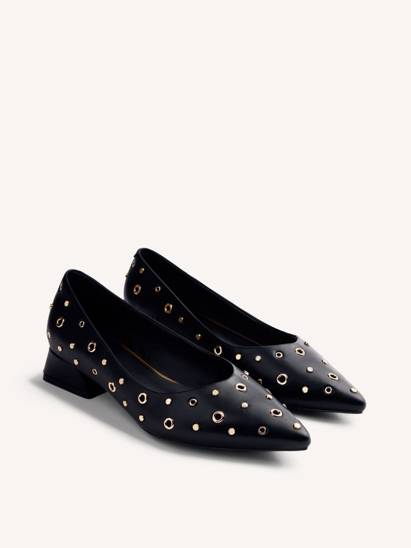 Sapatos com tachas e ilhós em acabamento dourado. Biqueira pontiaguda. Têm palmilha acolchoada e salto baixo em bloco com uma peça metálica no interior. Altura do salto: 3 cm. Cabedal e forro em poliuretano. Palmilha em couro. Sola de borracha flexível.