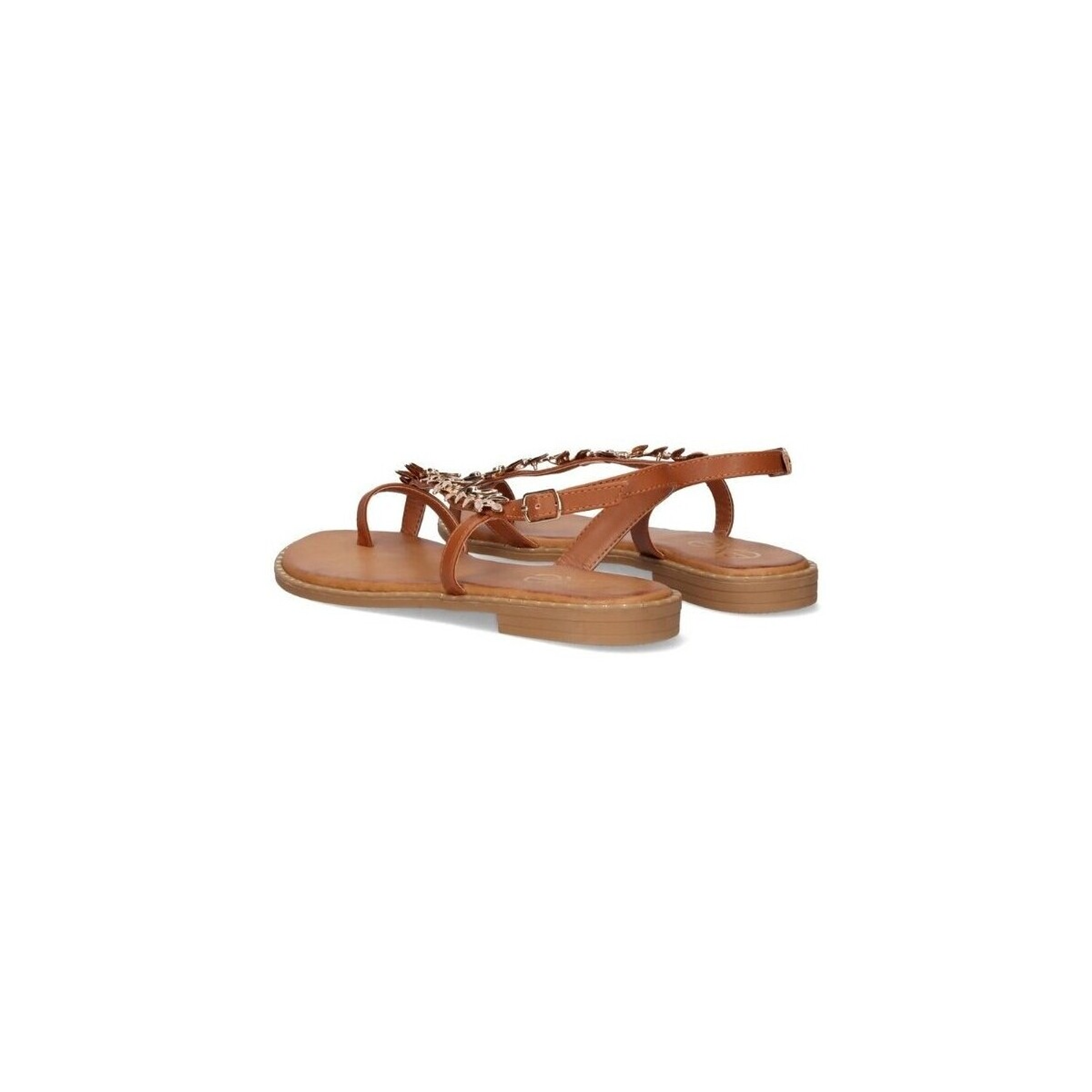 Sandálias em pele camel com detalhes de folhas em dourado no peito do pé.