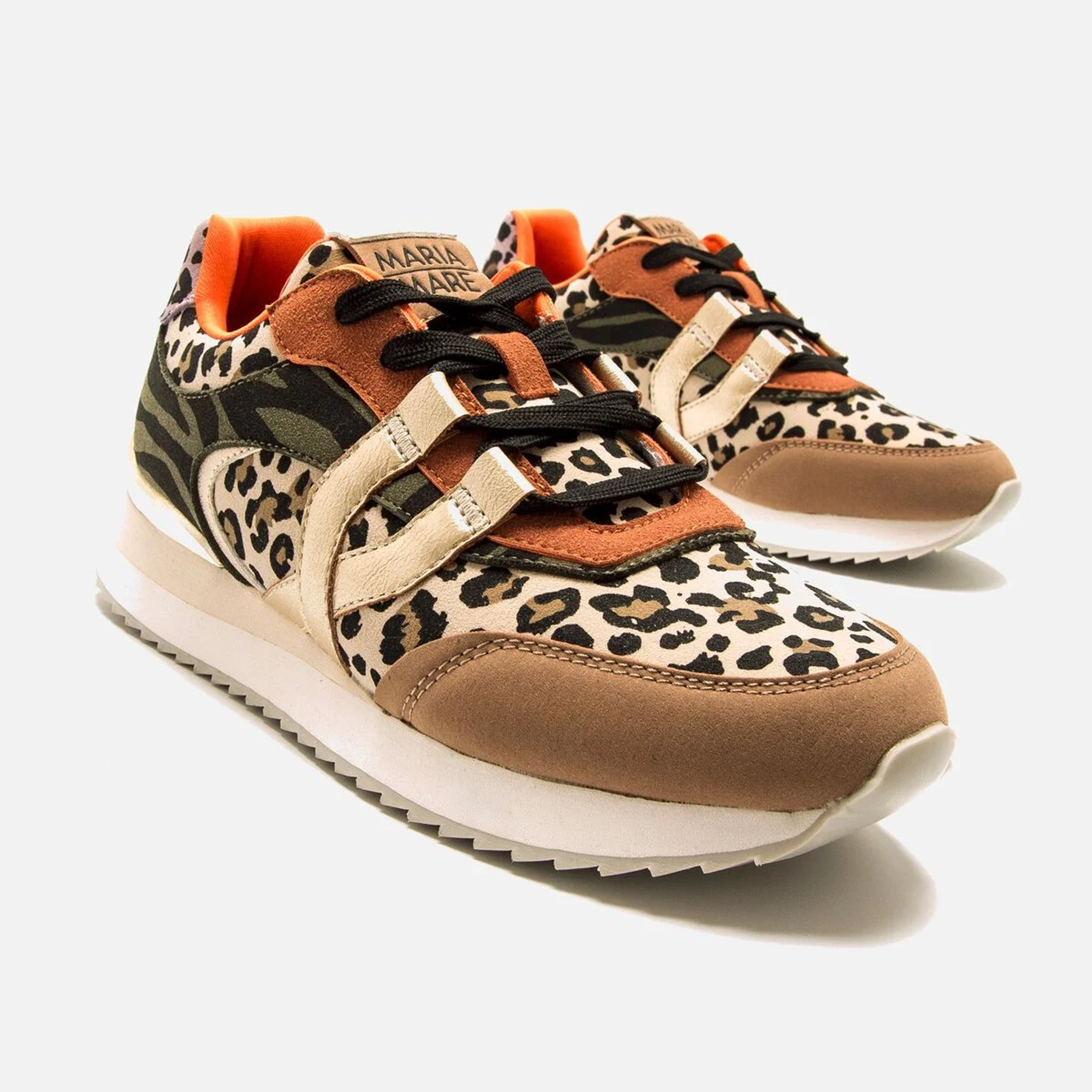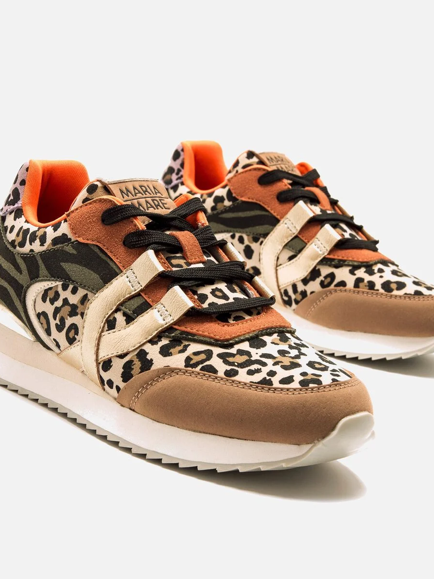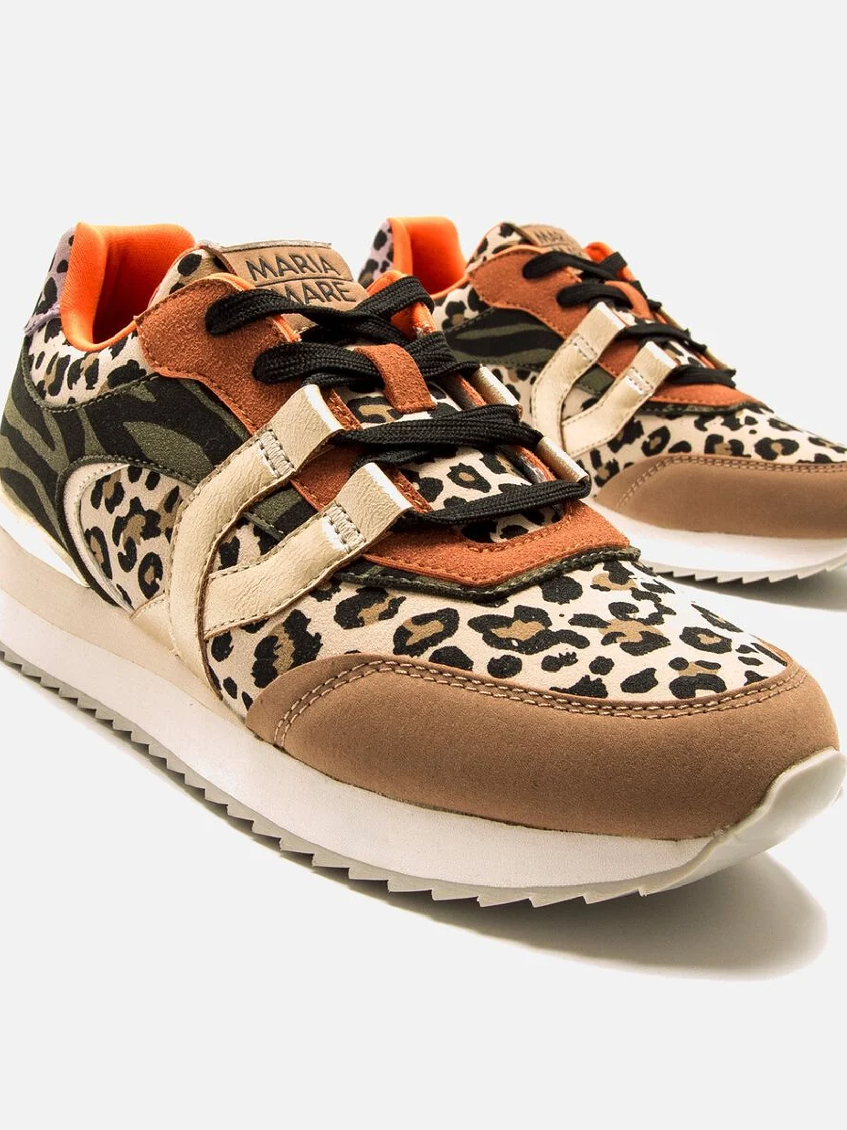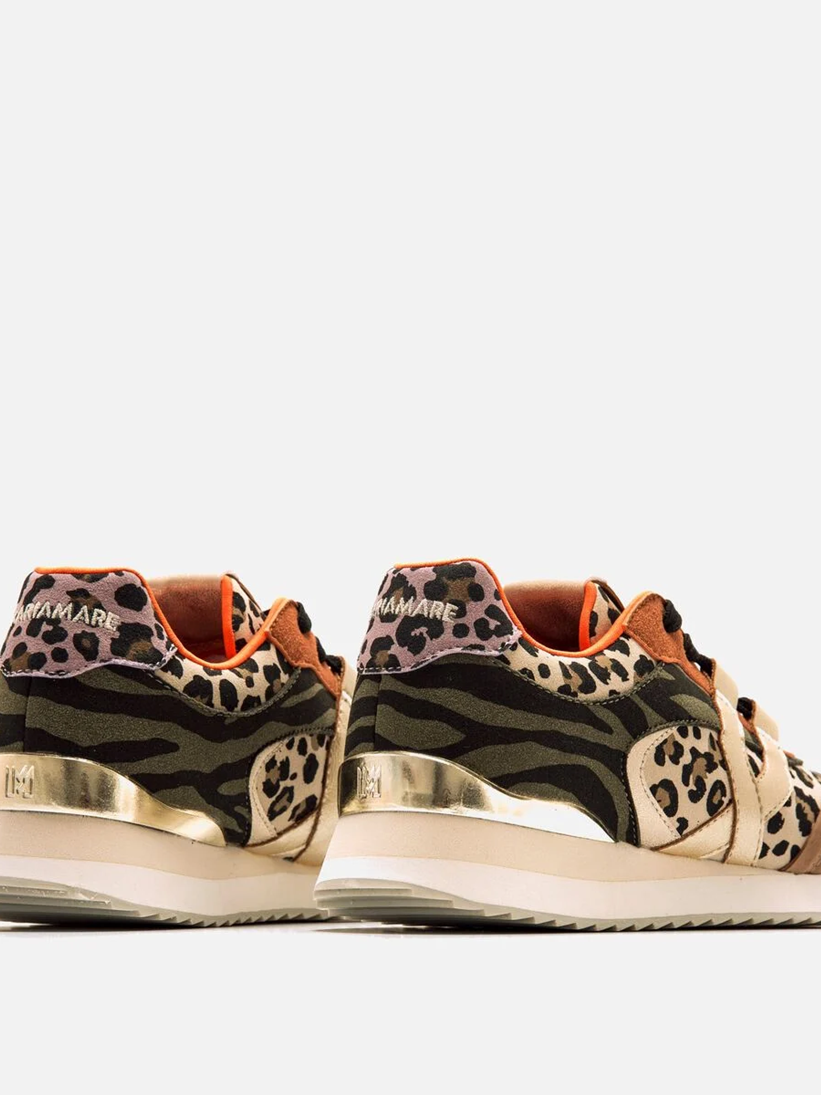 Ténis com animal print para mulher da Mariamare, modelo Narita Basic de estilo desportivo e urbano. Design que mistura padrões de leopardo e zebra em tons de bege, roxo e verde com painéis lisos em castanho e tijolo e metalizados prateados, criando um visual ousado e marcante. Sola branca com base dentada para leveza e aderência, interior almofadado em laranja néon para maior conforto. Ideal para quem procura um look arrojado e moderno sem perder conforto.