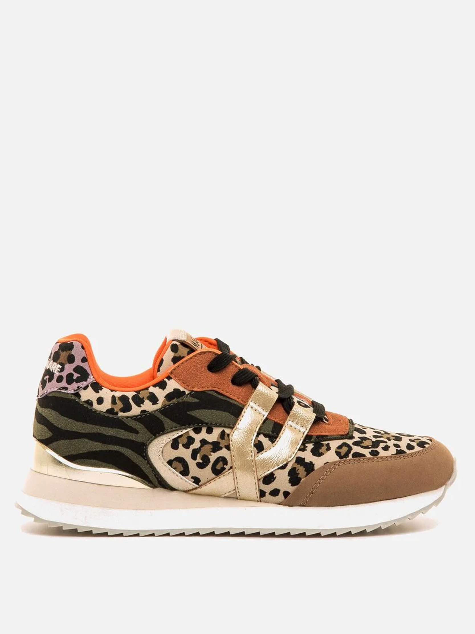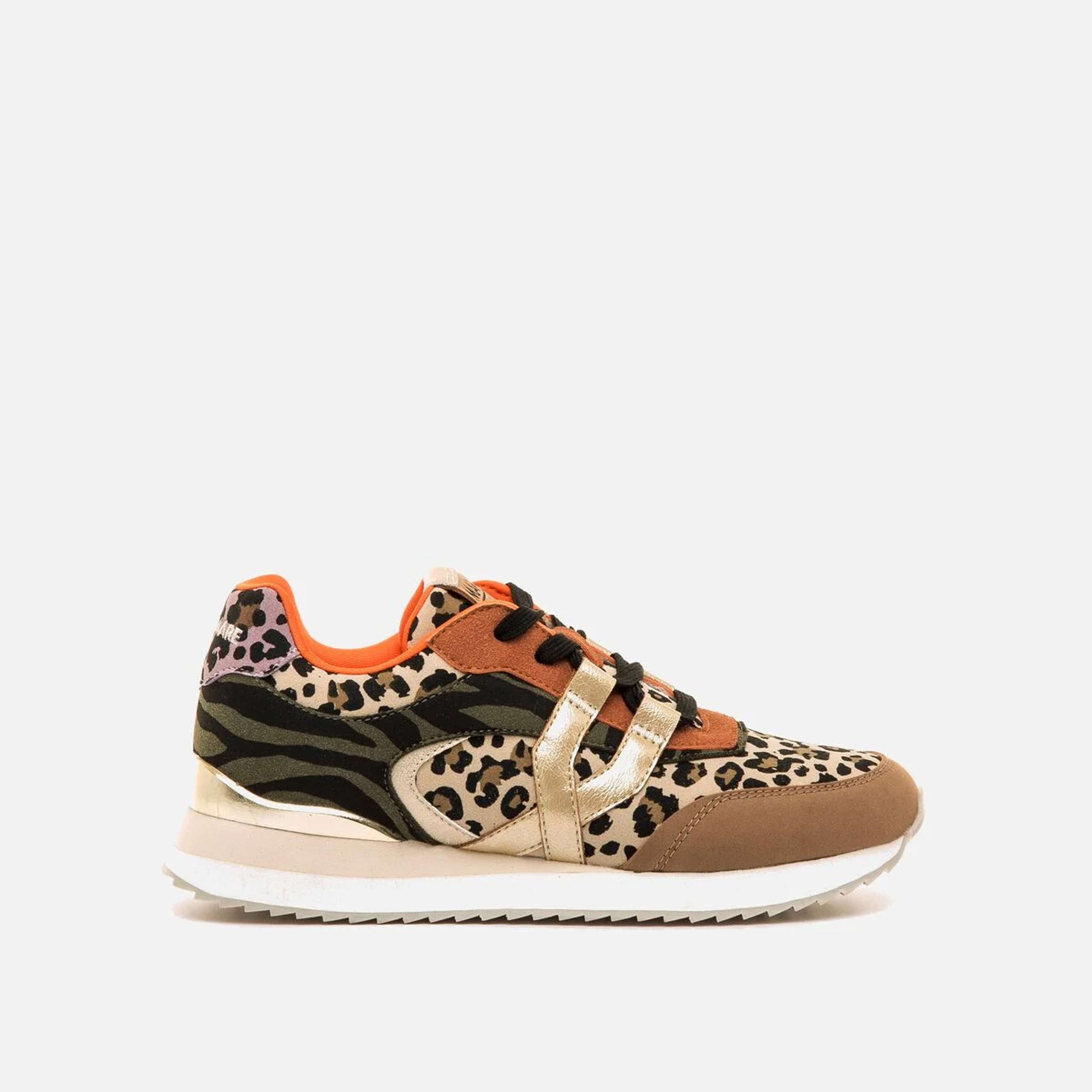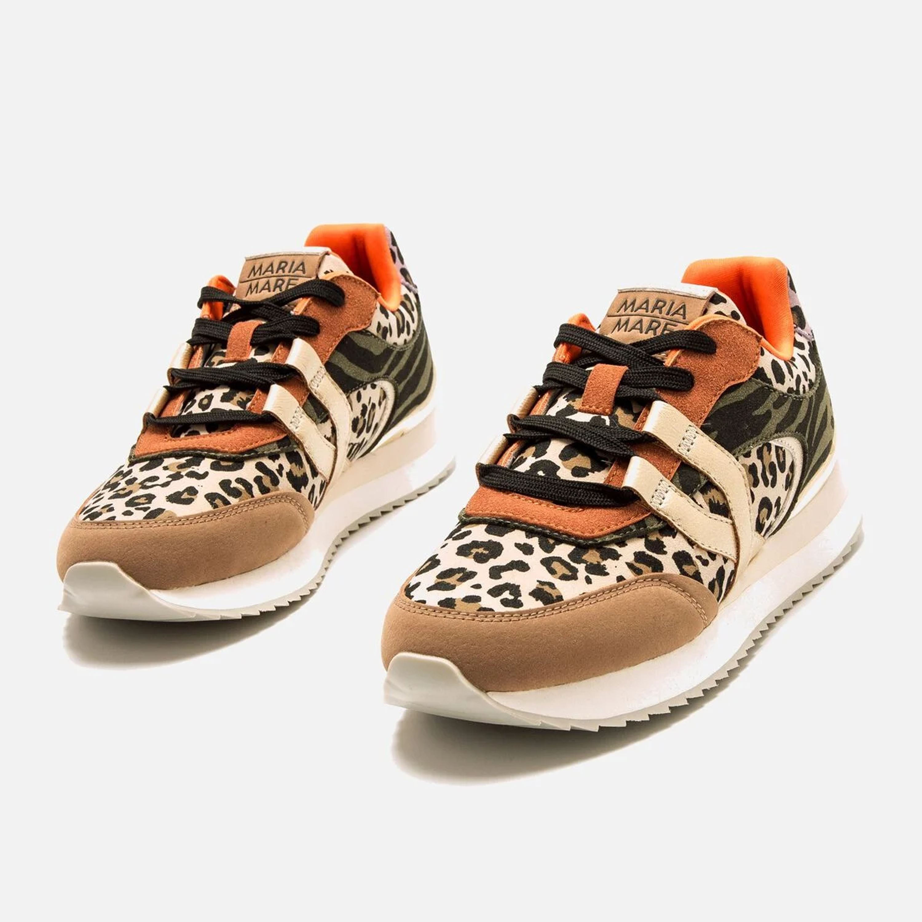 Ténis com animal print para mulher da Mariamare, modelo Narita Basic de estilo desportivo e urbano. Design que mistura padrões de leopardo e zebra em tons de bege, roxo e verde com painéis lisos em castanho e tijolo e metalizados prateados, criando um visual ousado e marcante. Sola branca com base dentada para leveza e aderência, interior almofadado em laranja néon para maior conforto. Ideal para quem procura um look arrojado e moderno sem perder conforto.
