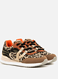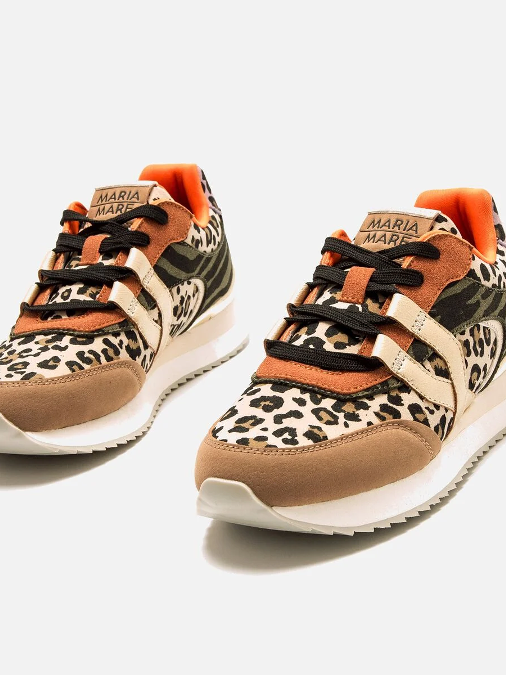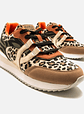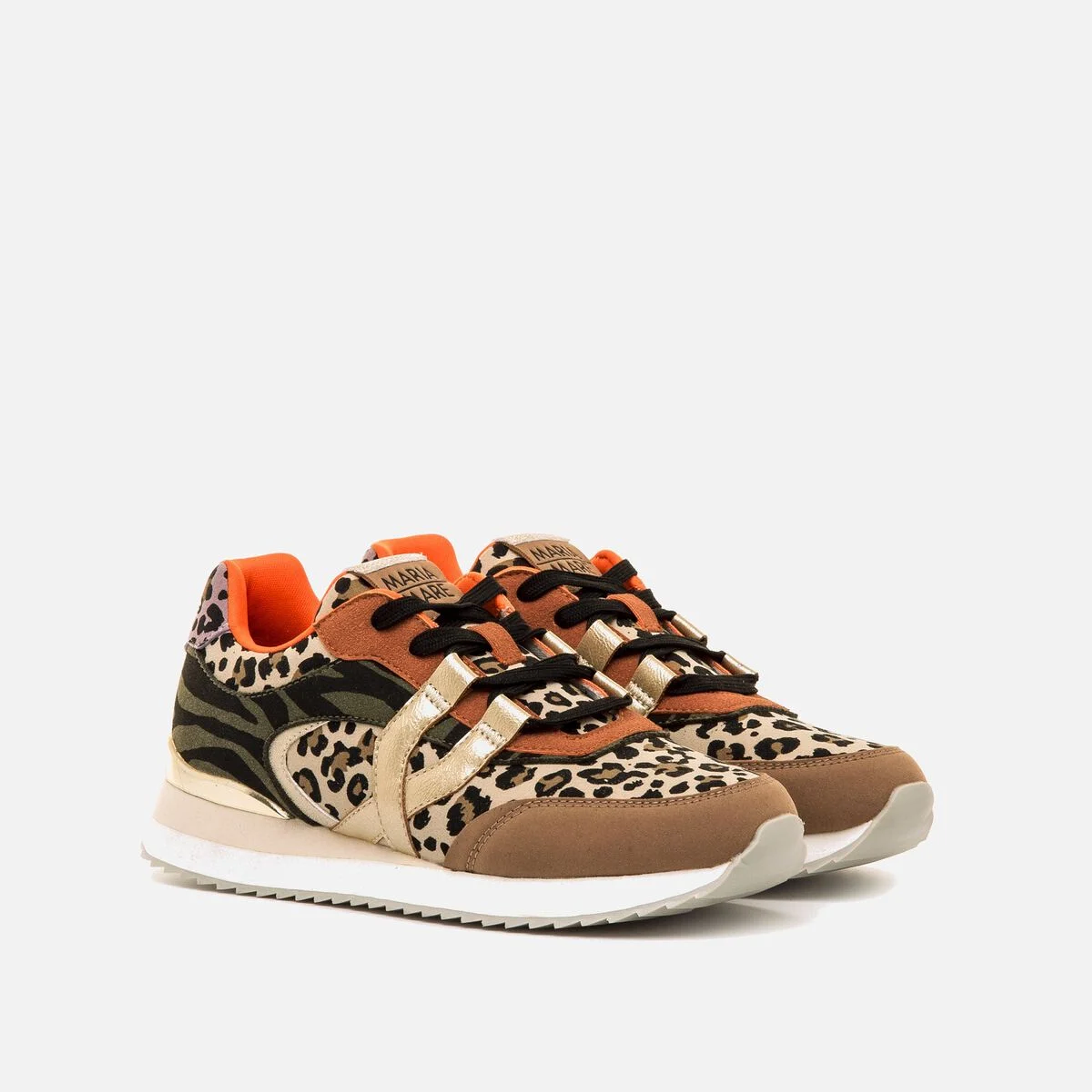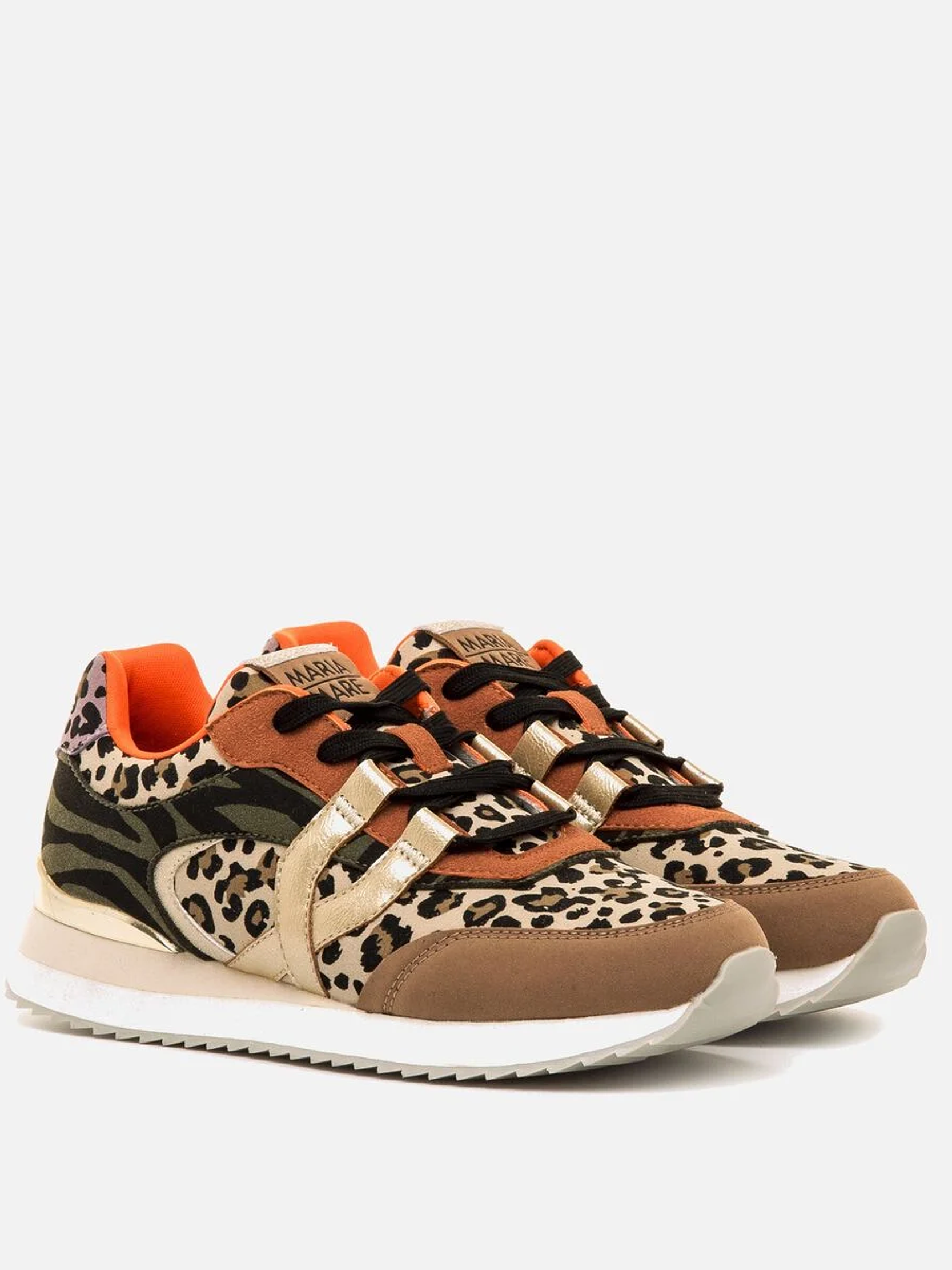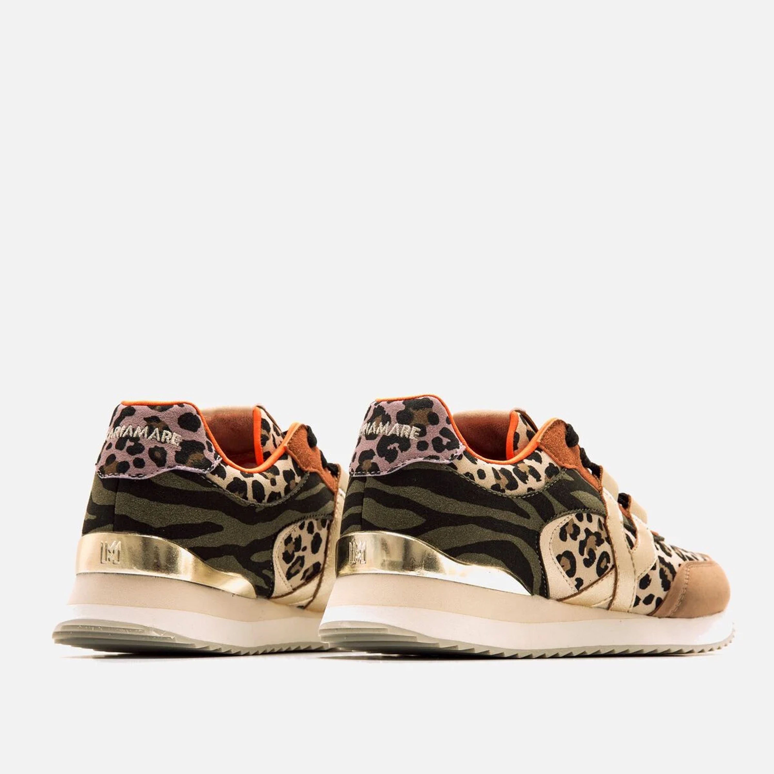 Ténis com animal print para mulher da Mariamare, modelo Narita Basic de estilo desportivo e urbano. Design que mistura padrões de leopardo e zebra em tons de bege, roxo e verde com painéis lisos em castanho e tijolo e metalizados prateados, criando um visual ousado e marcante. Sola branca com base dentada para leveza e aderência, interior almofadado em laranja néon para maior conforto. Ideal para quem procura um look arrojado e moderno sem perder conforto.