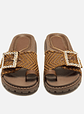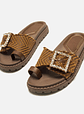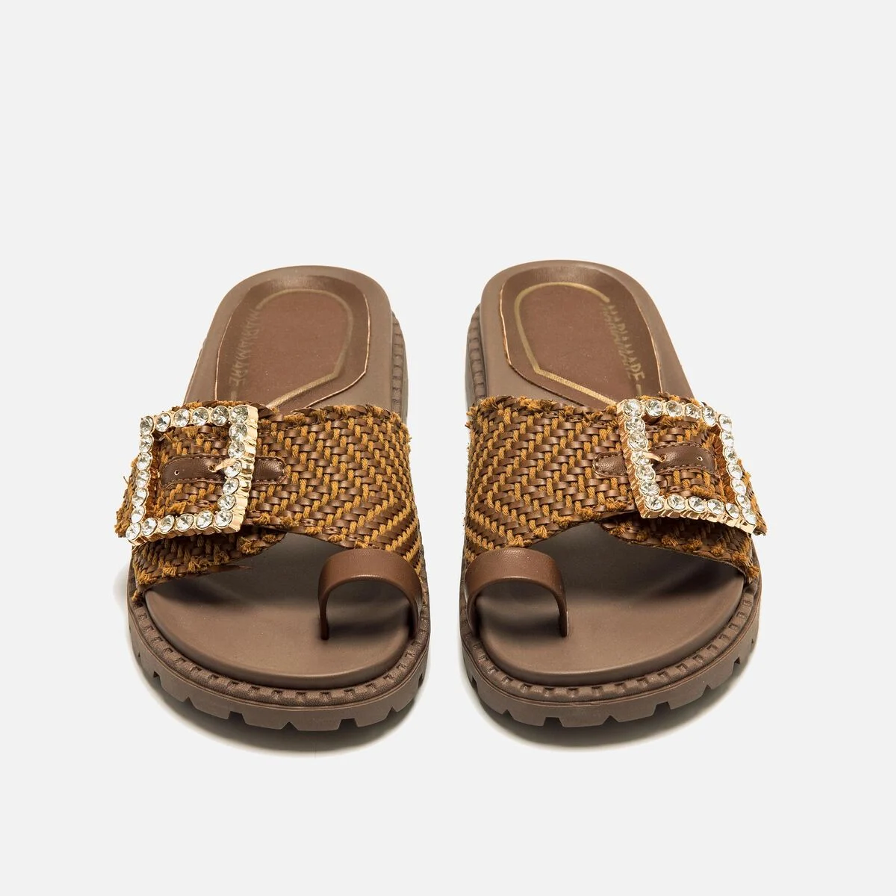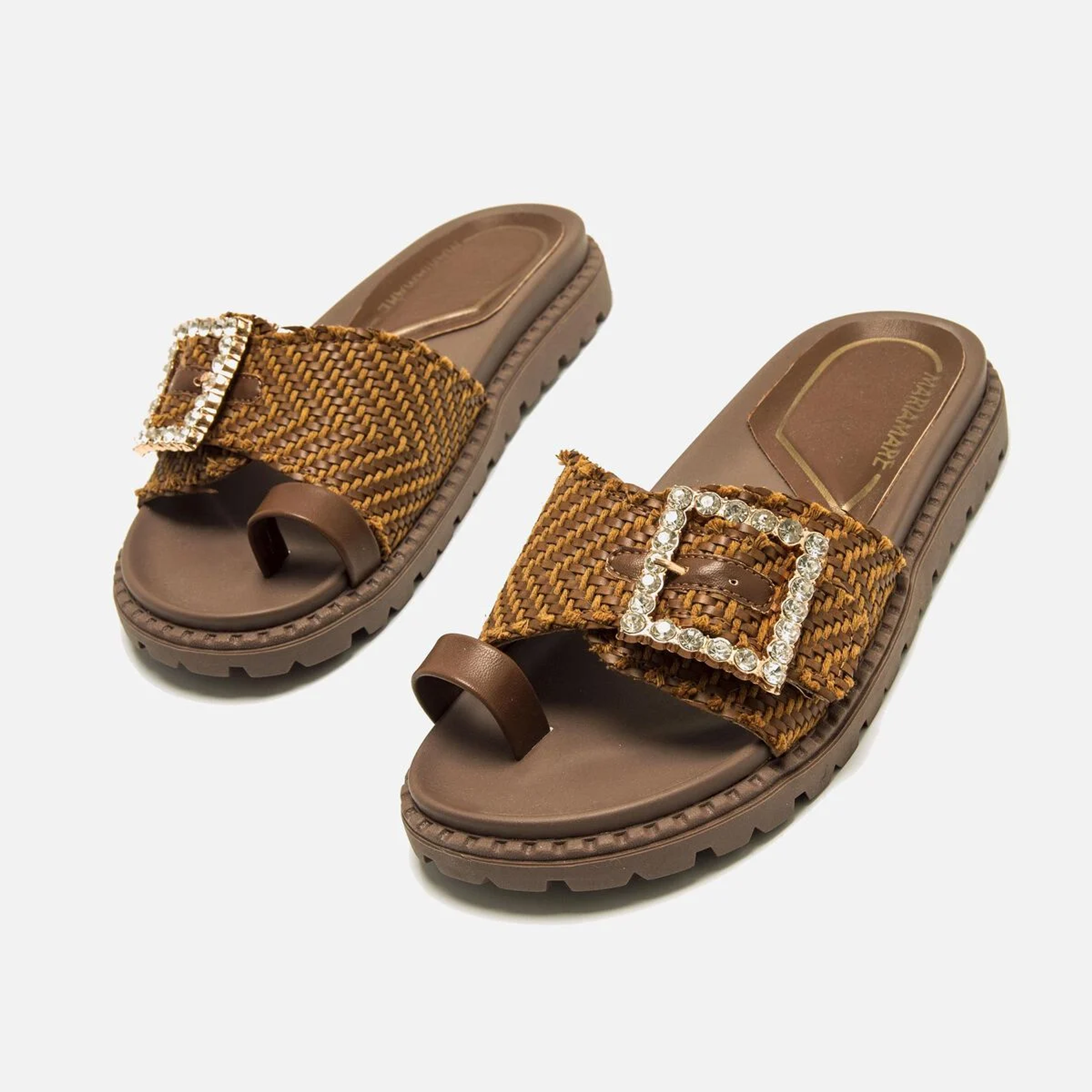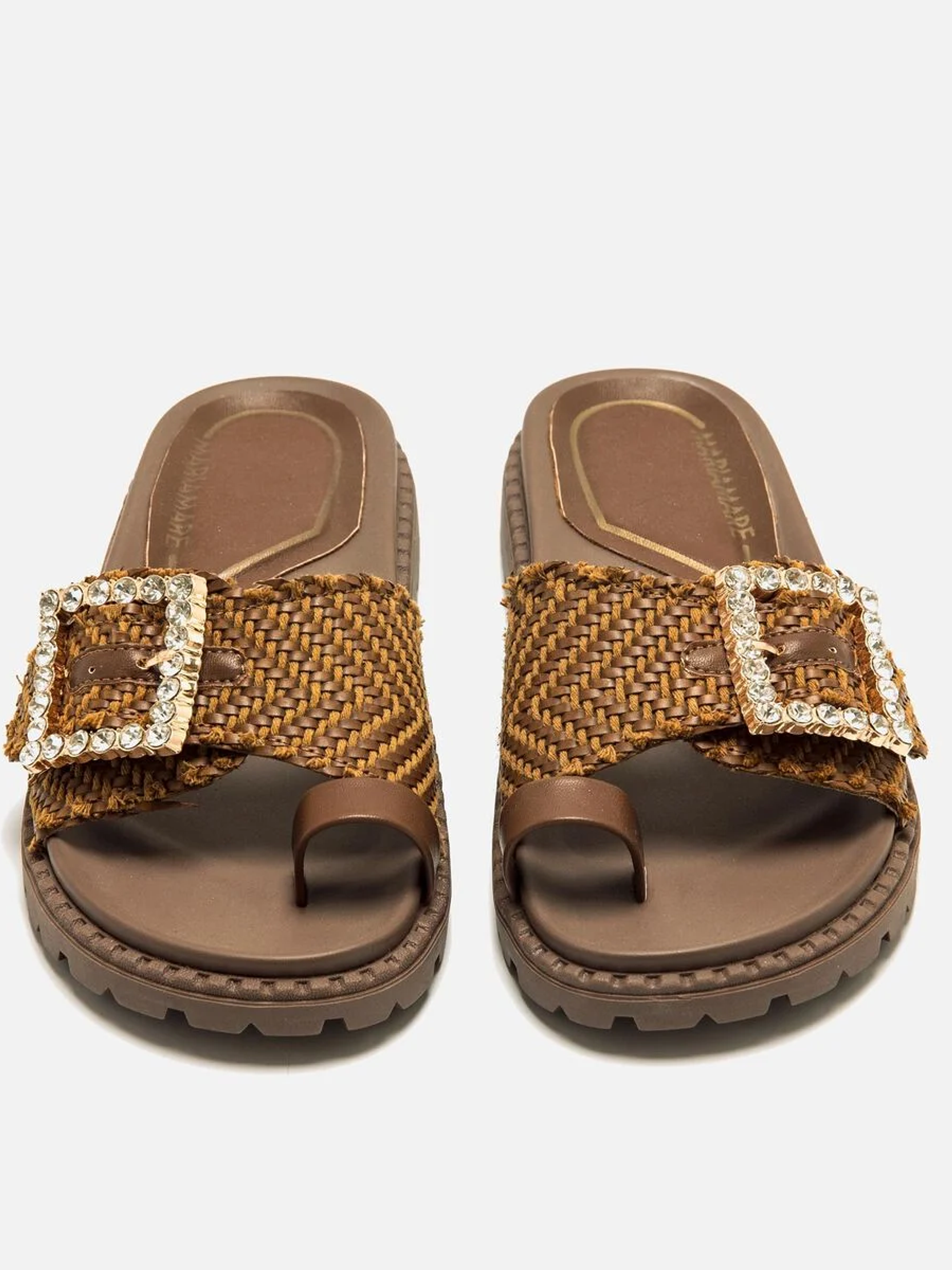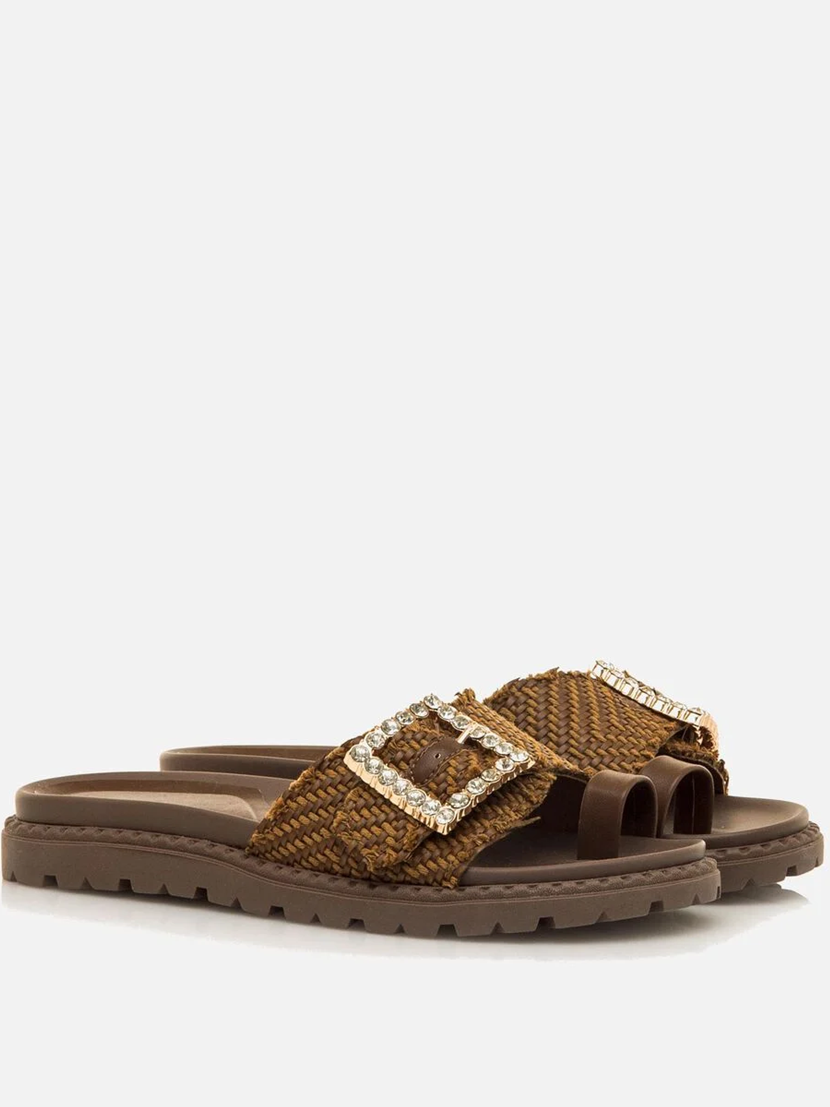 Sandálias rasas de pala em cor moka para mulher. Este design combina conforto e estilo com uma banda de tecido entrançado que incorpora uma chamativa fivela decorativa adornada com pedraria. Inclui uma pequena tira em cor castanha para o dedo grande, que oferece suporte adicional e um toque moderno. A sua sola dentada garante uma aderência ótima, ideal para o uso diário. Estas sandálias destacam-se pelo seu design original e pela versatilidade, acrescentando um toque distinto a qualquer look de verão