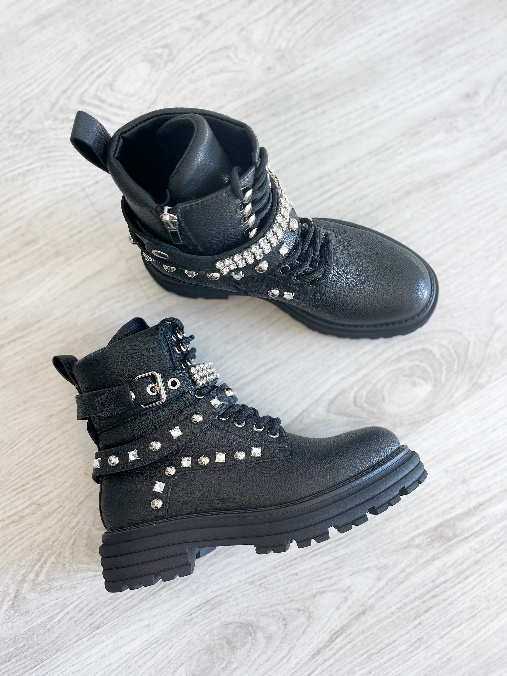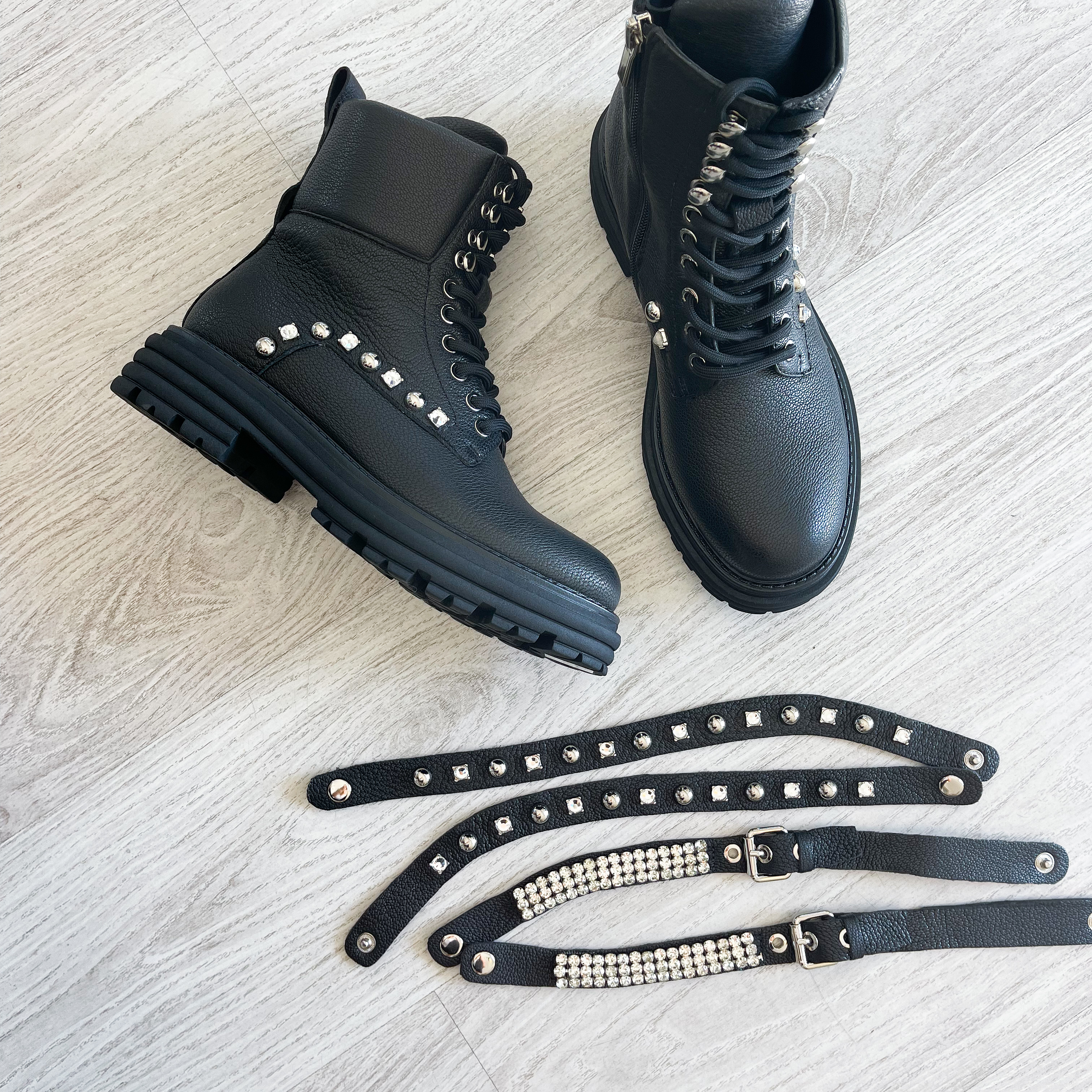 Botas em pele preta com tachas prateadas e duas correntes removíveis!