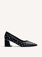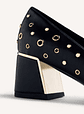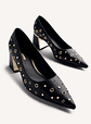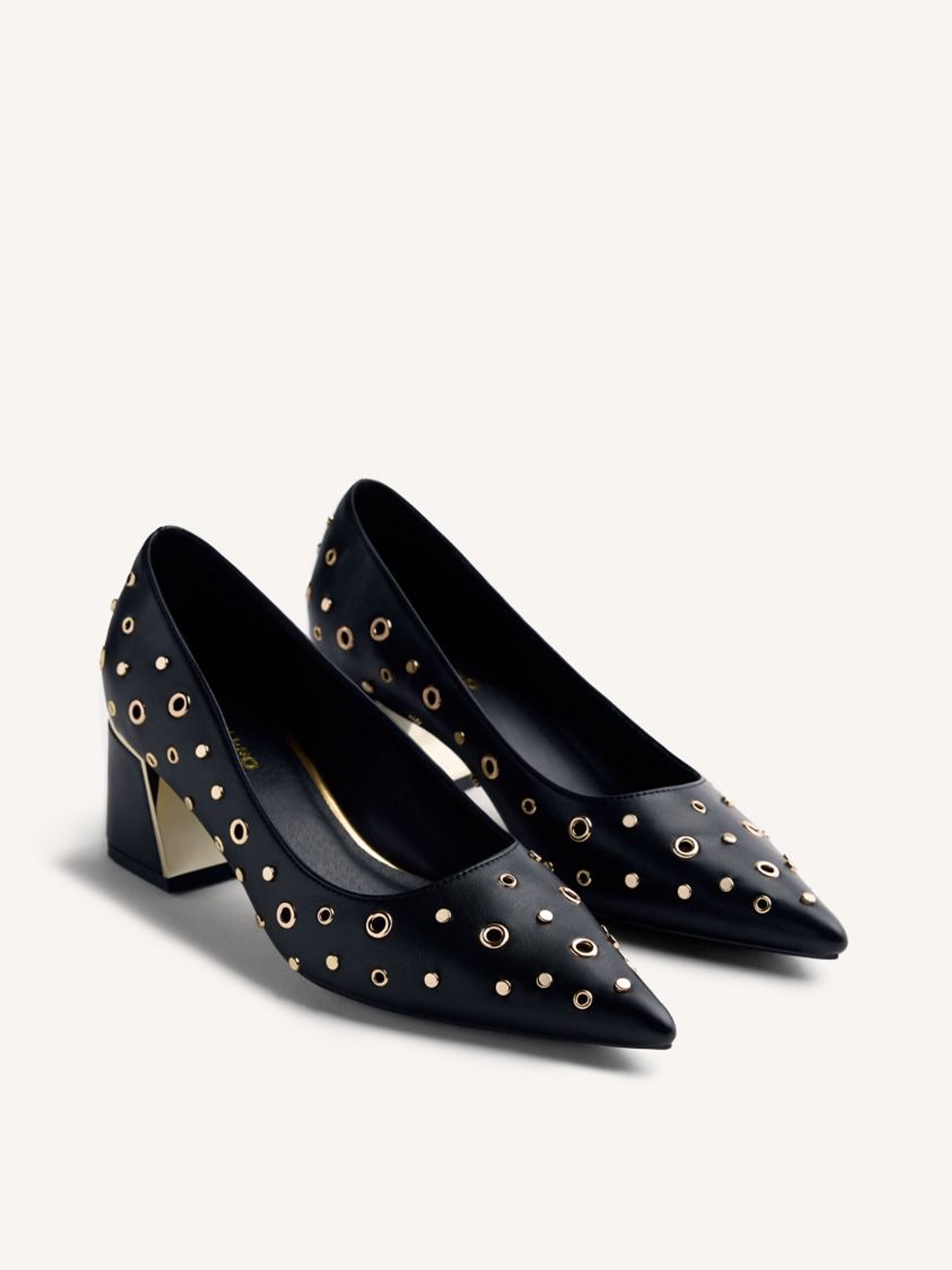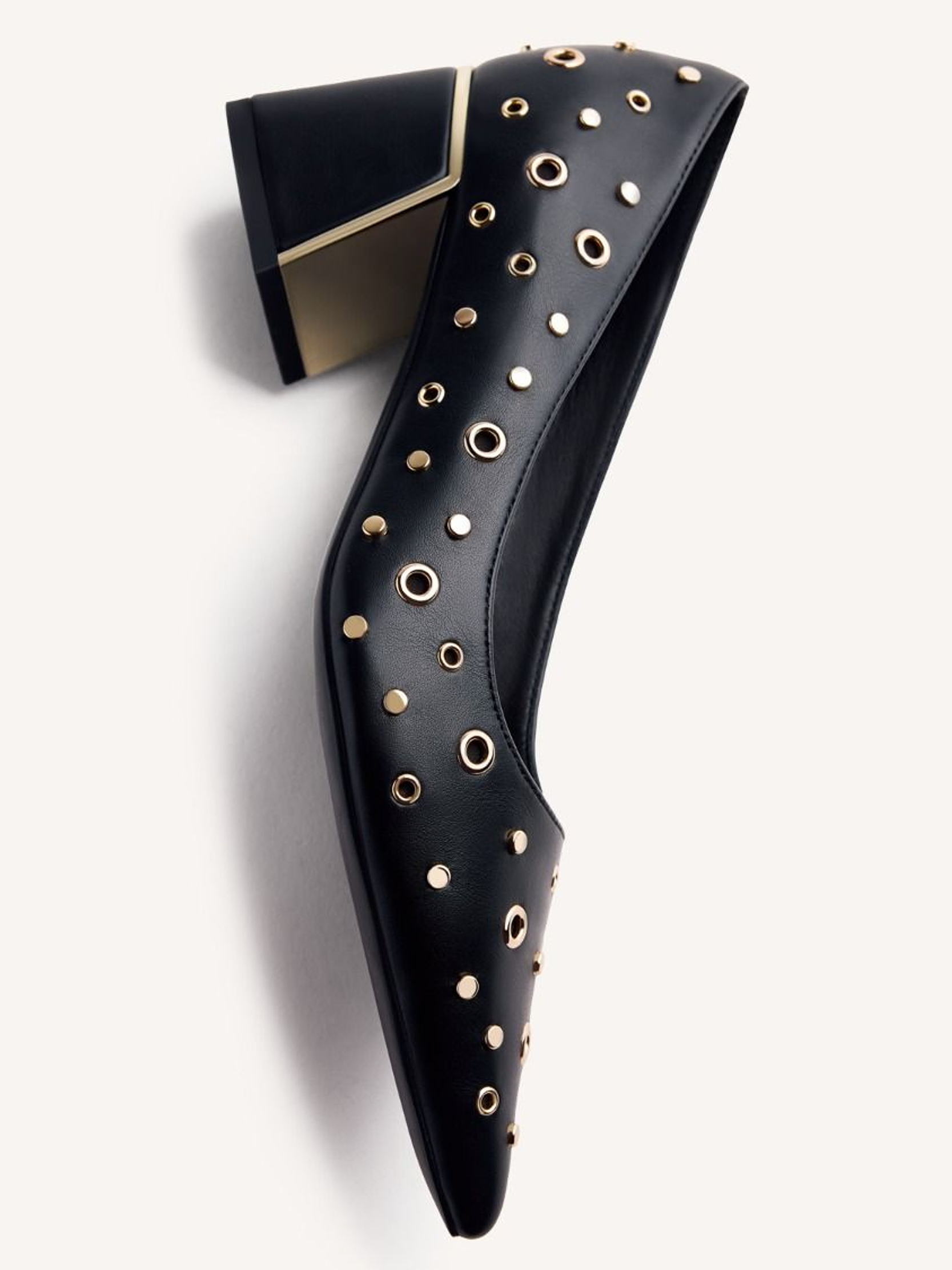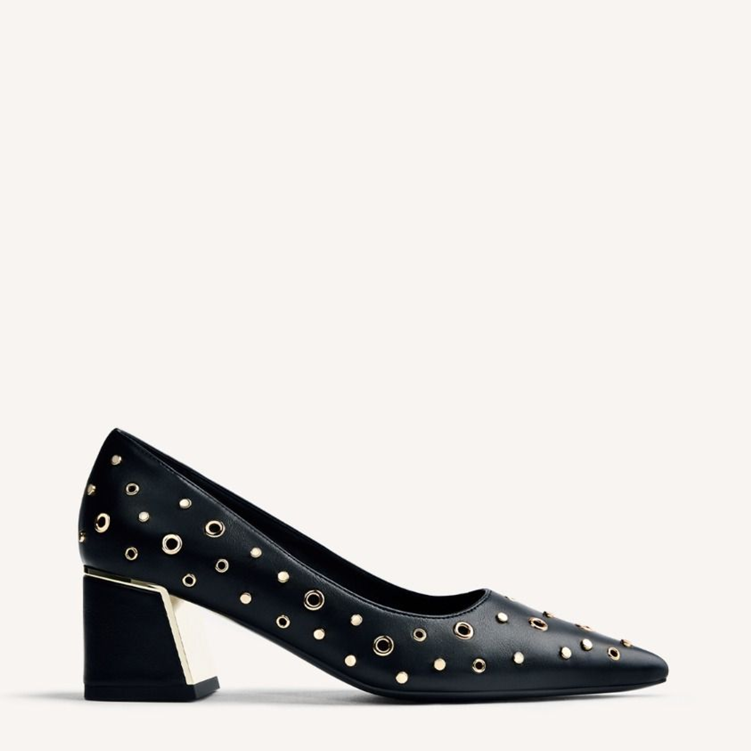 Sapatos com tachas e ilhós em acabamento dourado. Biqueira pontiaguda. Têm sola acolchoada e salto em bloco com uma peça metálica no interior. Altura do salto: 5,5 cm. Cabedal e forro em poliuretano. Palmilha em couro. Sola em borracha.