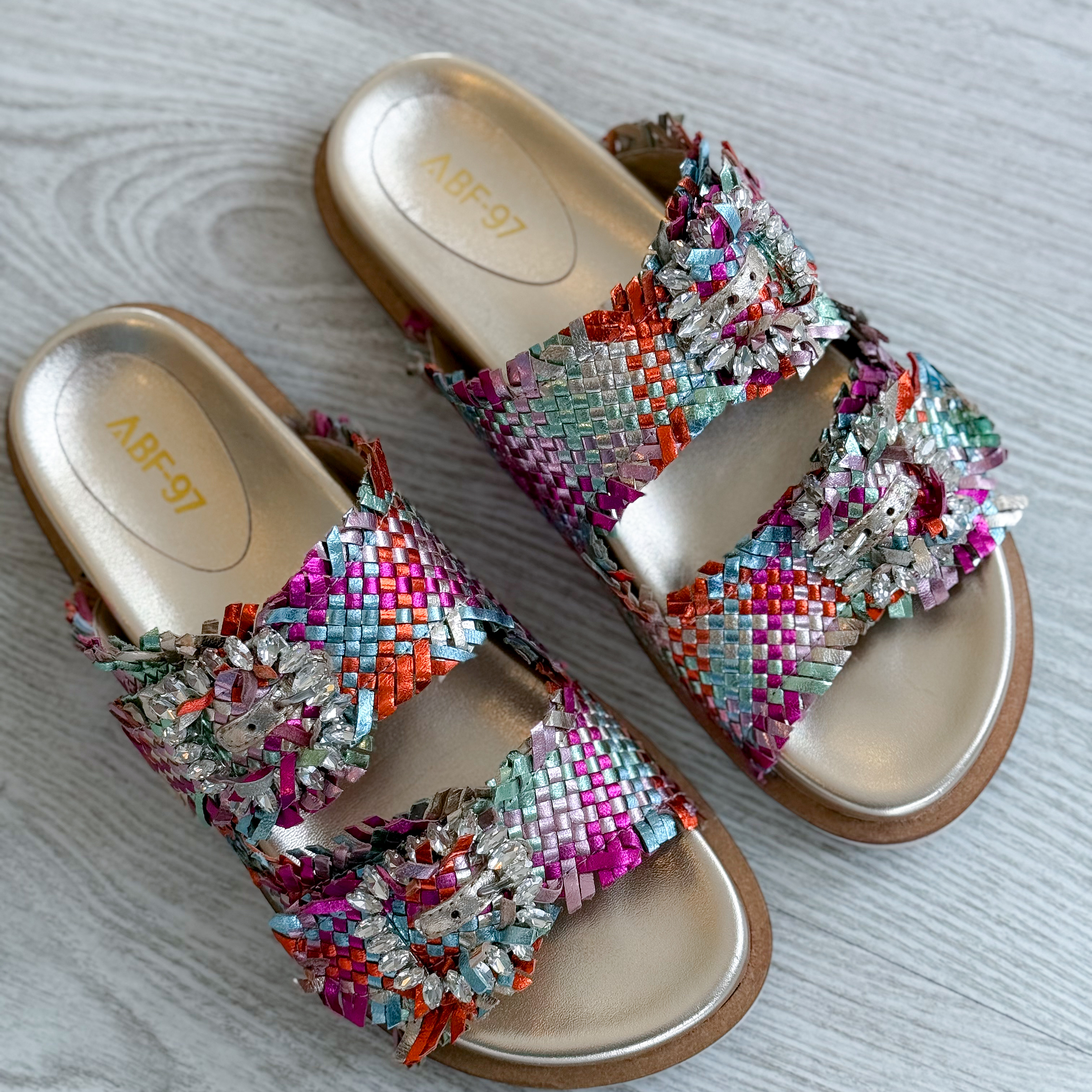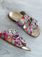 Sandálias em pele entrançada multicolour com fivela com jóias