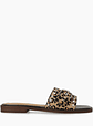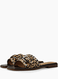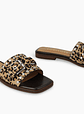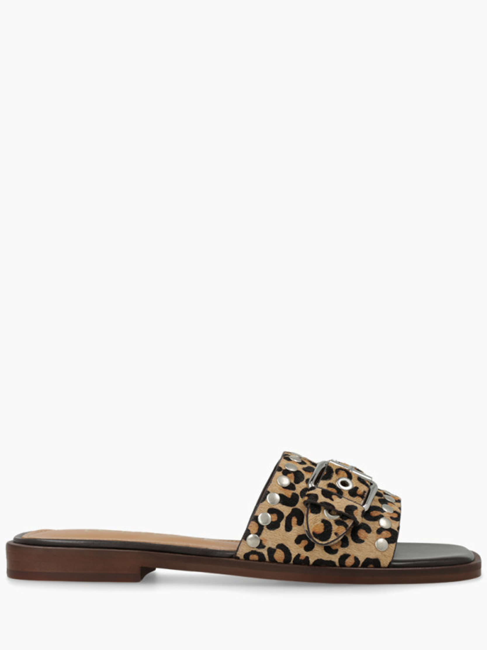 Chinelos em pele de pelinho leopardo com detalhes e tachas douradas. Desenhadas com um salto largo de 2cm. Palmilha em gel para maior conforto, forro em pele.