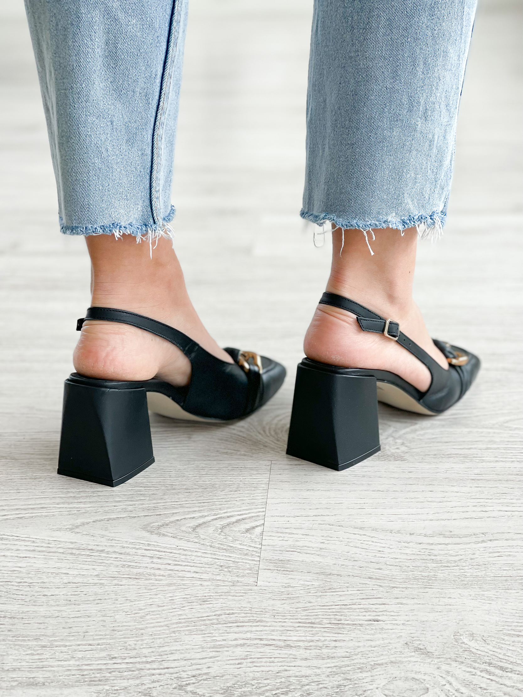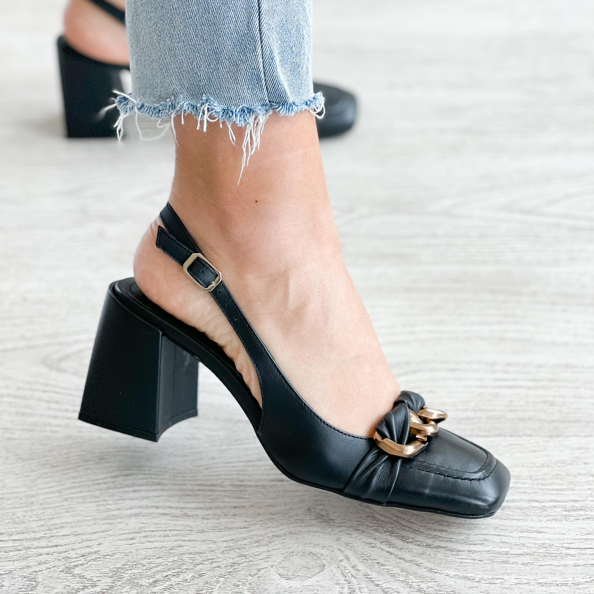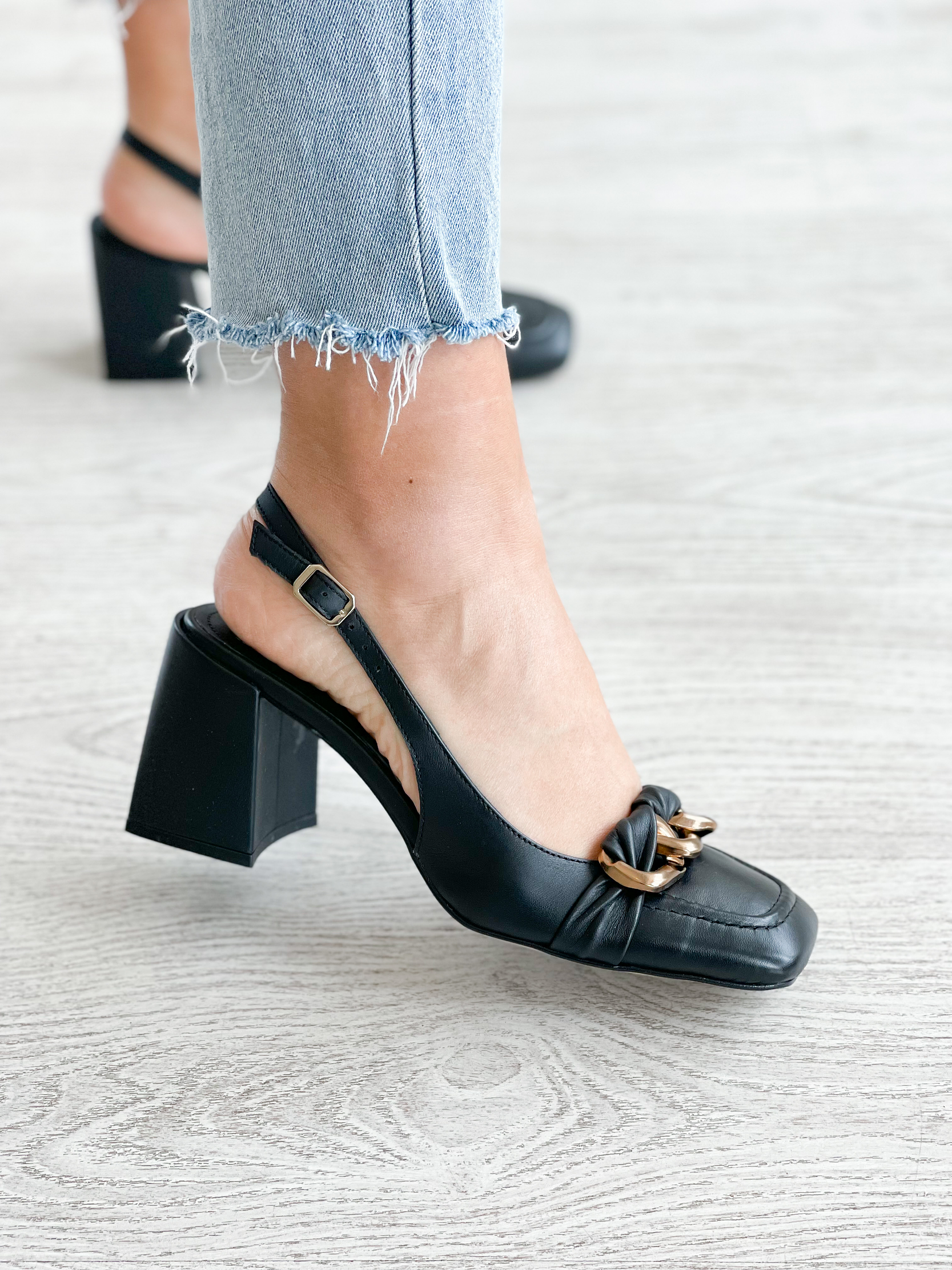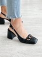 Sapatos em pele preta com corrente dourada na frente