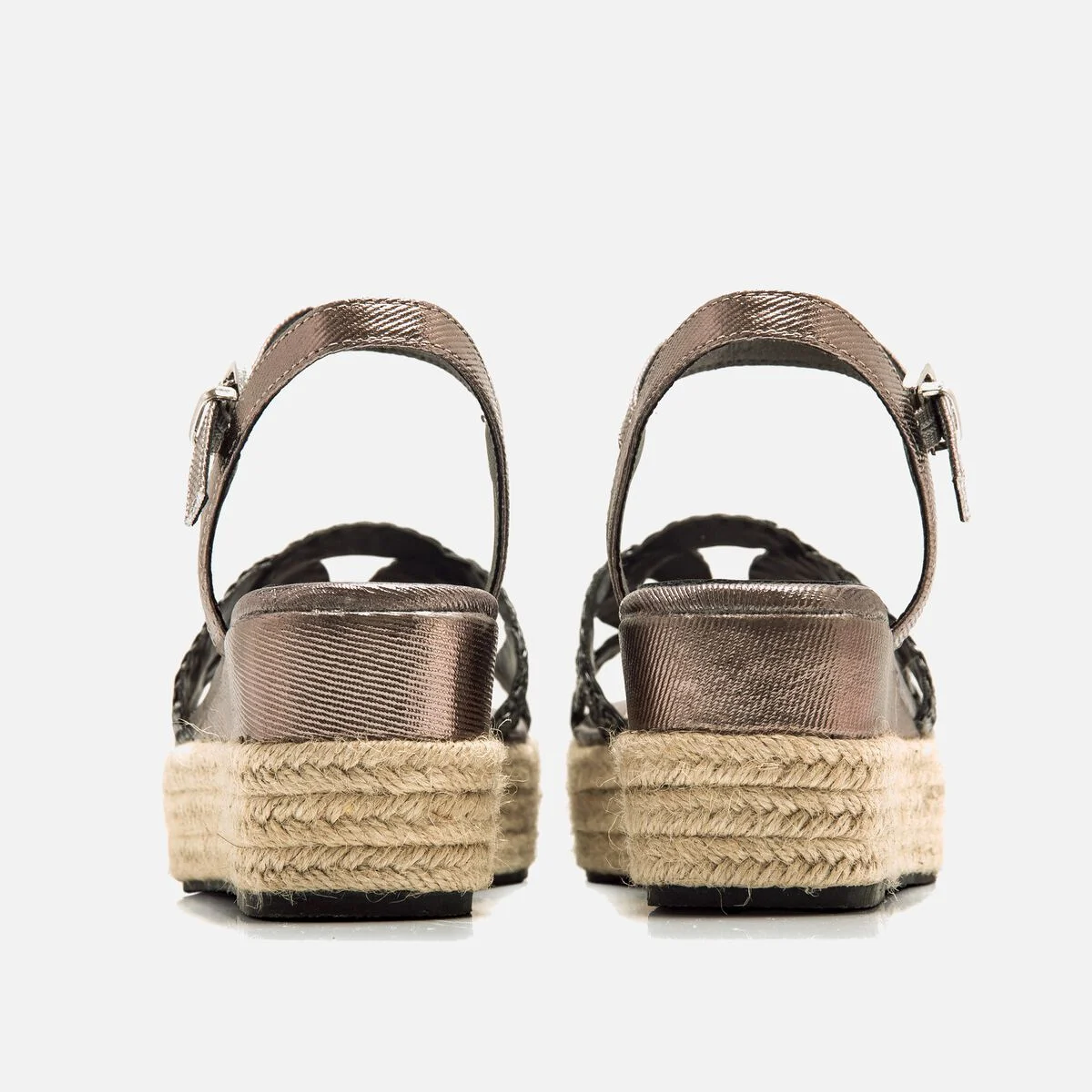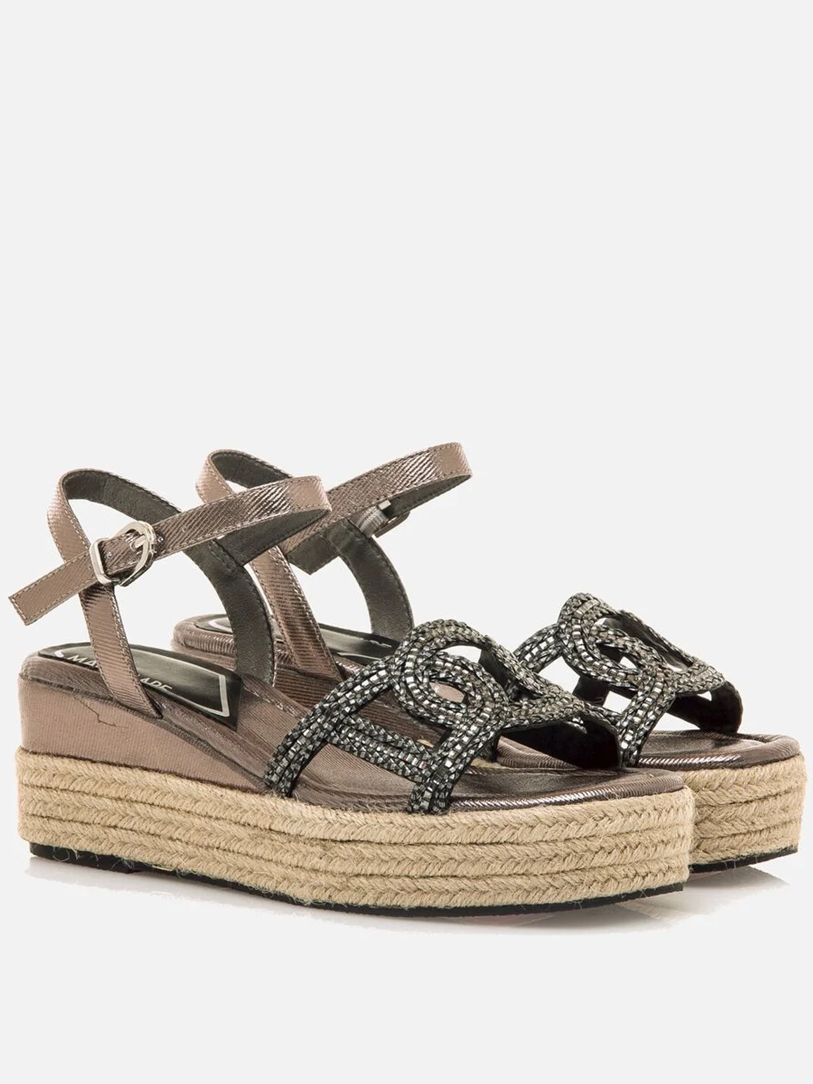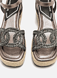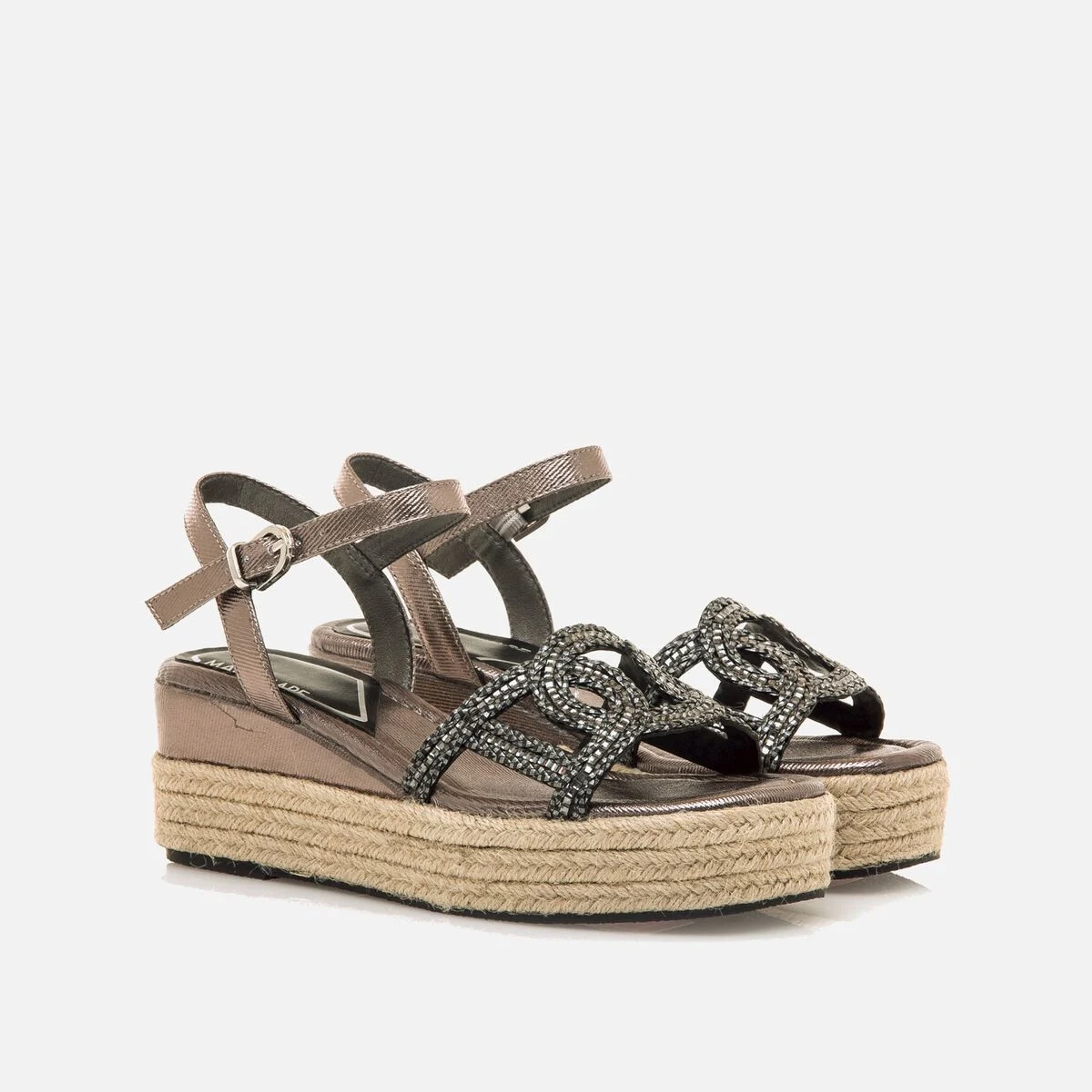 Sandálias de cunha na cor chumbo para mulher. Este design destaca-se pelas suas tiras cruzadas com detalhes em pedraria brilhante, que conferem um estilo romano. O fecho ajustável em pulseira com fivela no tornozelo garante uma fixação segura, enquanto a plataforma forrada em juta adiciona um toque natural. Perfeitas para complementar os teus looks com um estilo único e confortável