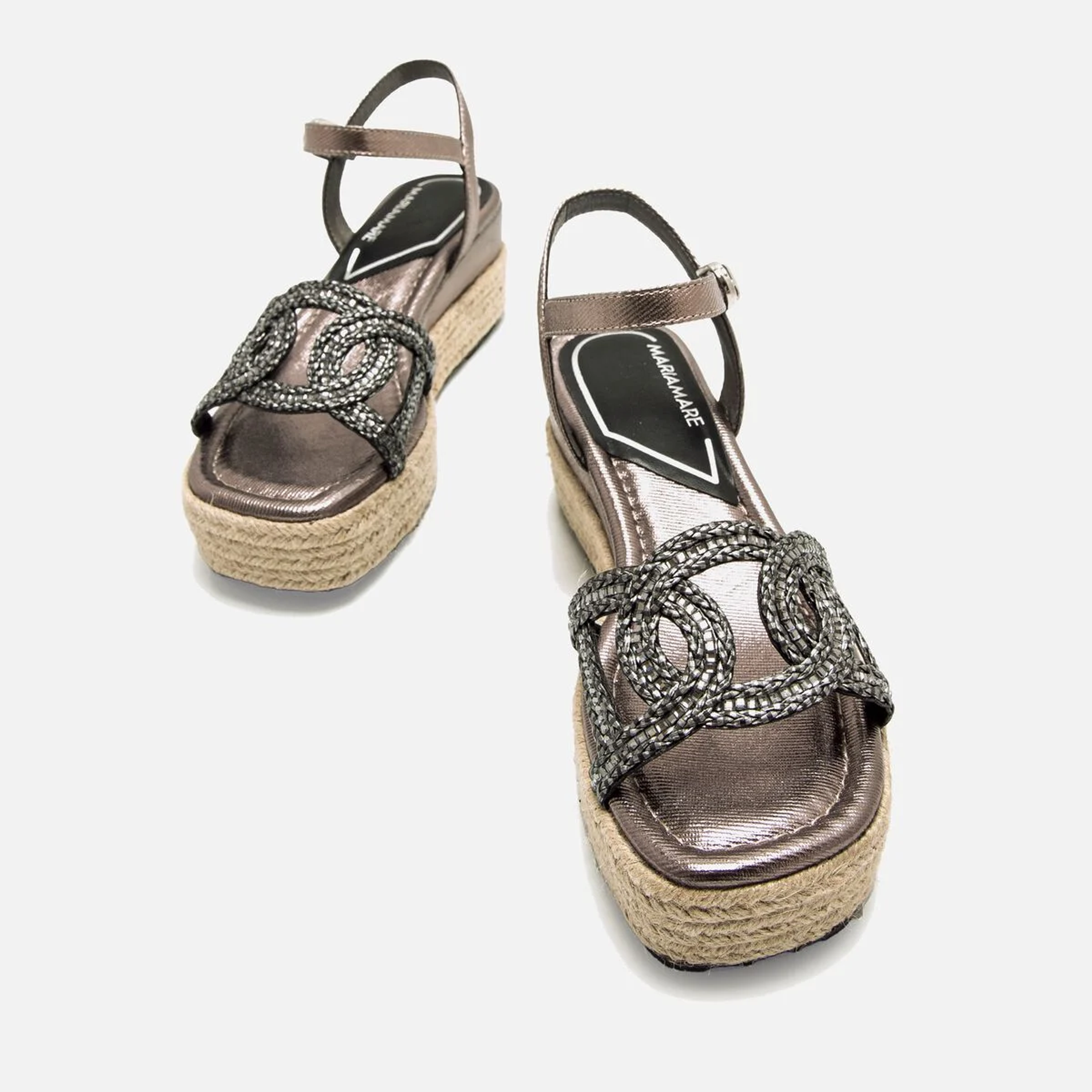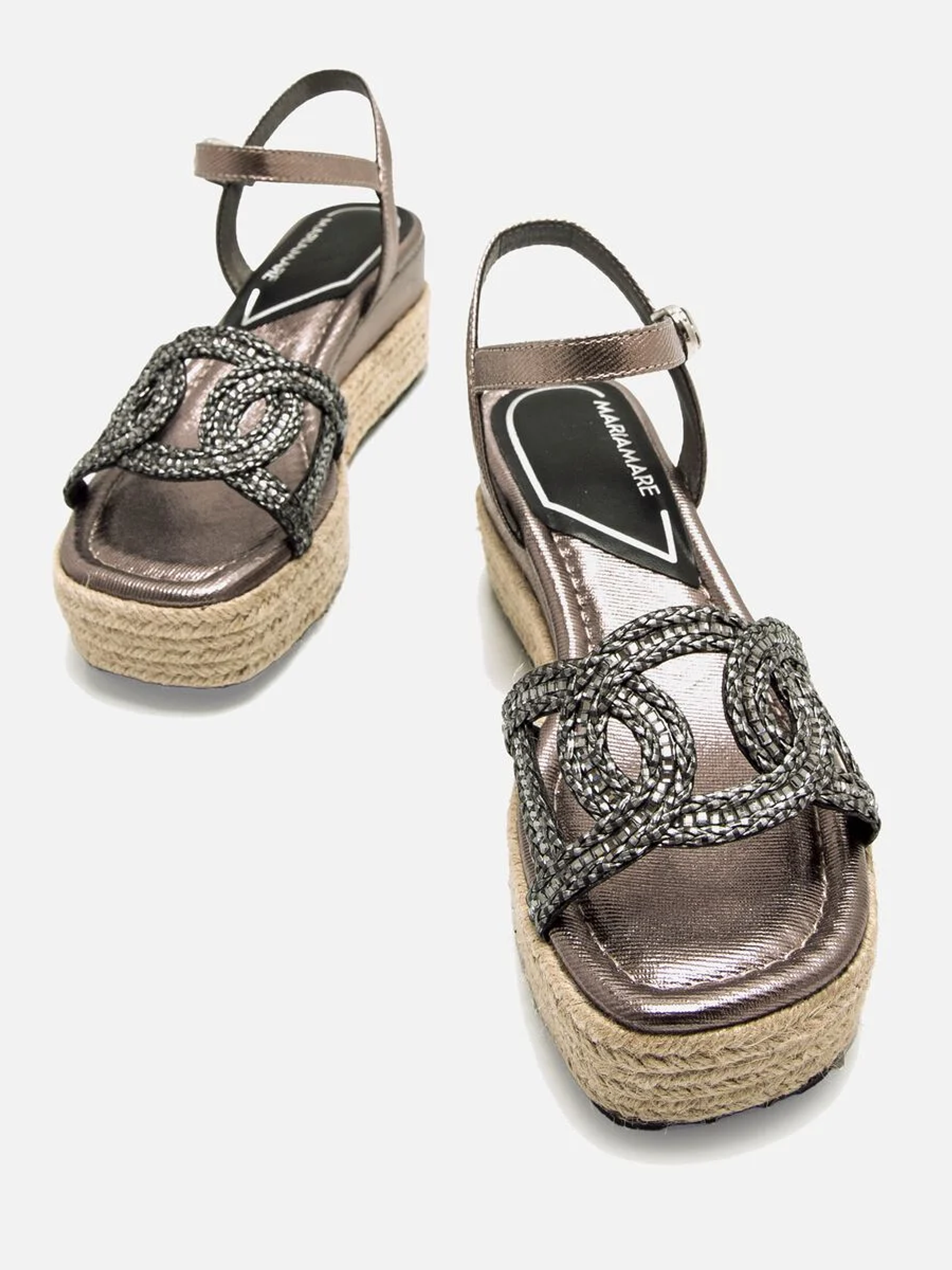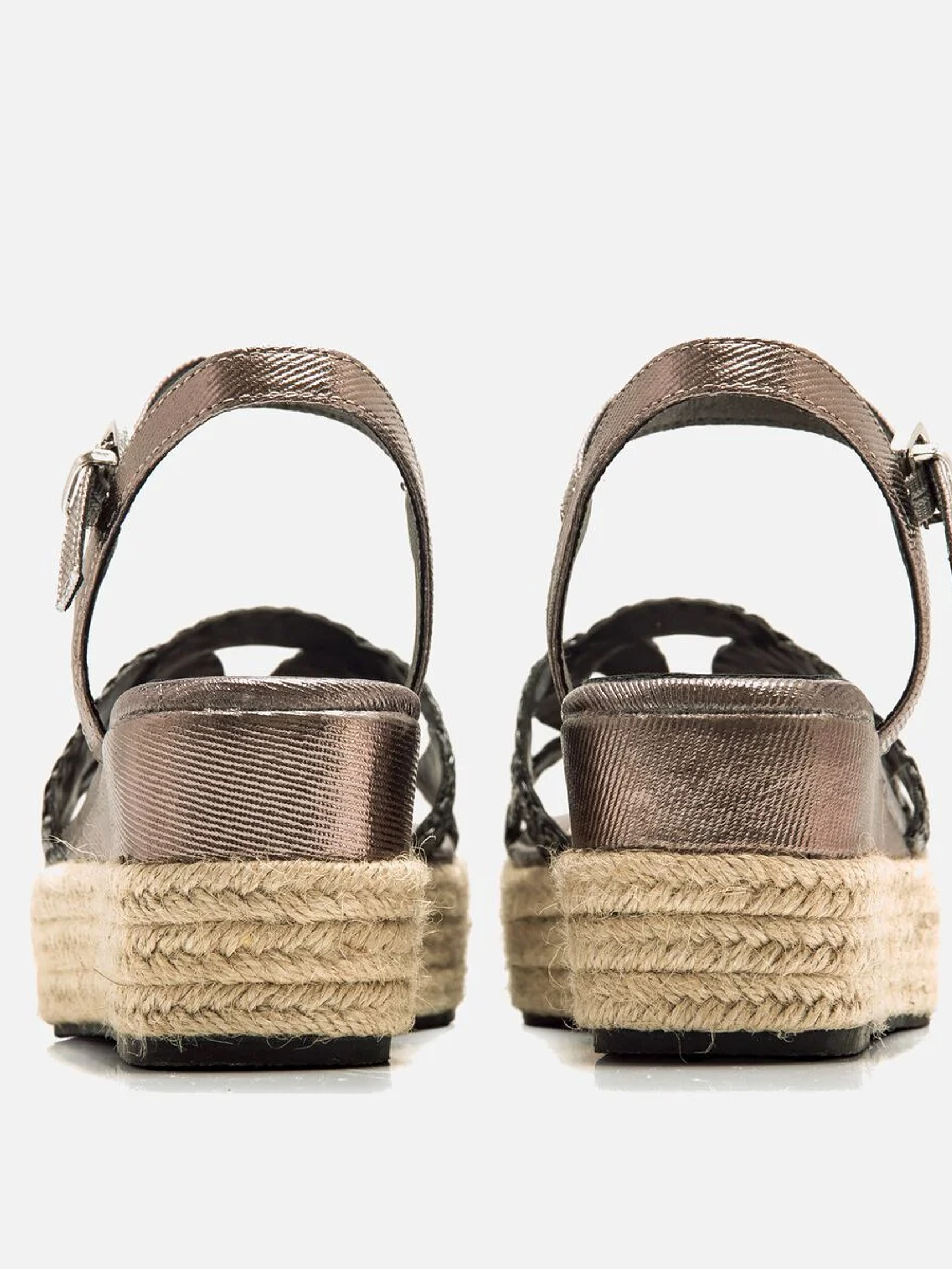 Sandálias de cunha na cor chumbo para mulher. Este design destaca-se pelas suas tiras cruzadas com detalhes em pedraria brilhante, que conferem um estilo romano. O fecho ajustável em pulseira com fivela no tornozelo garante uma fixação segura, enquanto a plataforma forrada em juta adiciona um toque natural. Perfeitas para complementar os teus looks com um estilo único e confortável