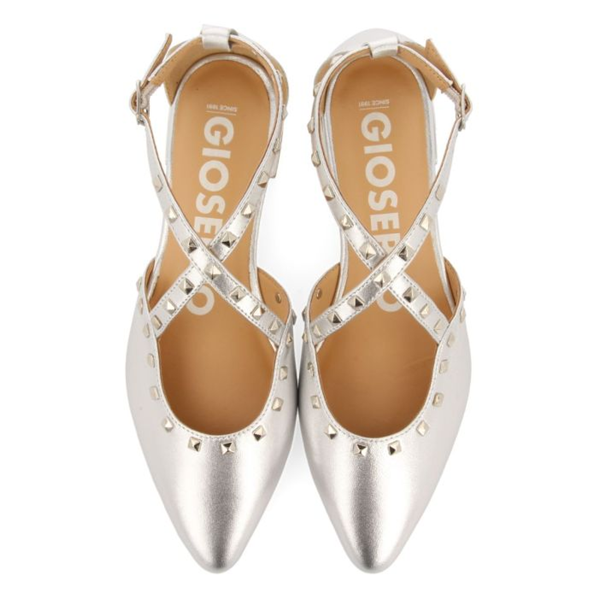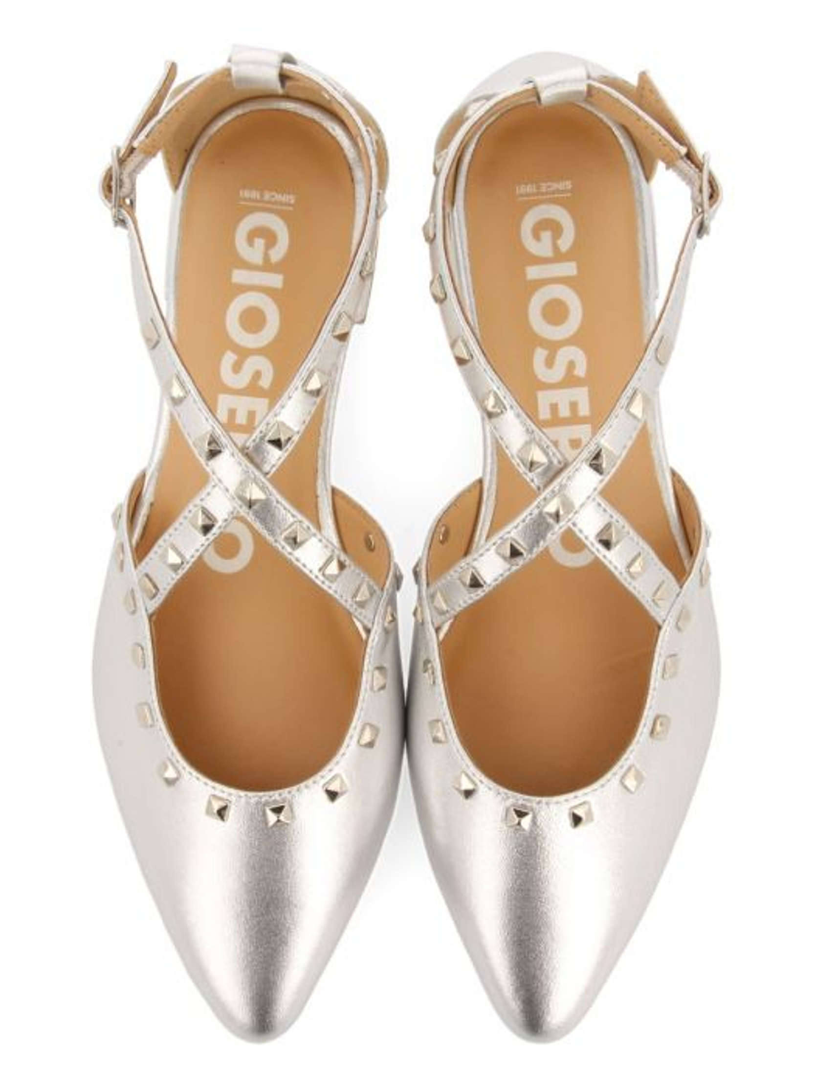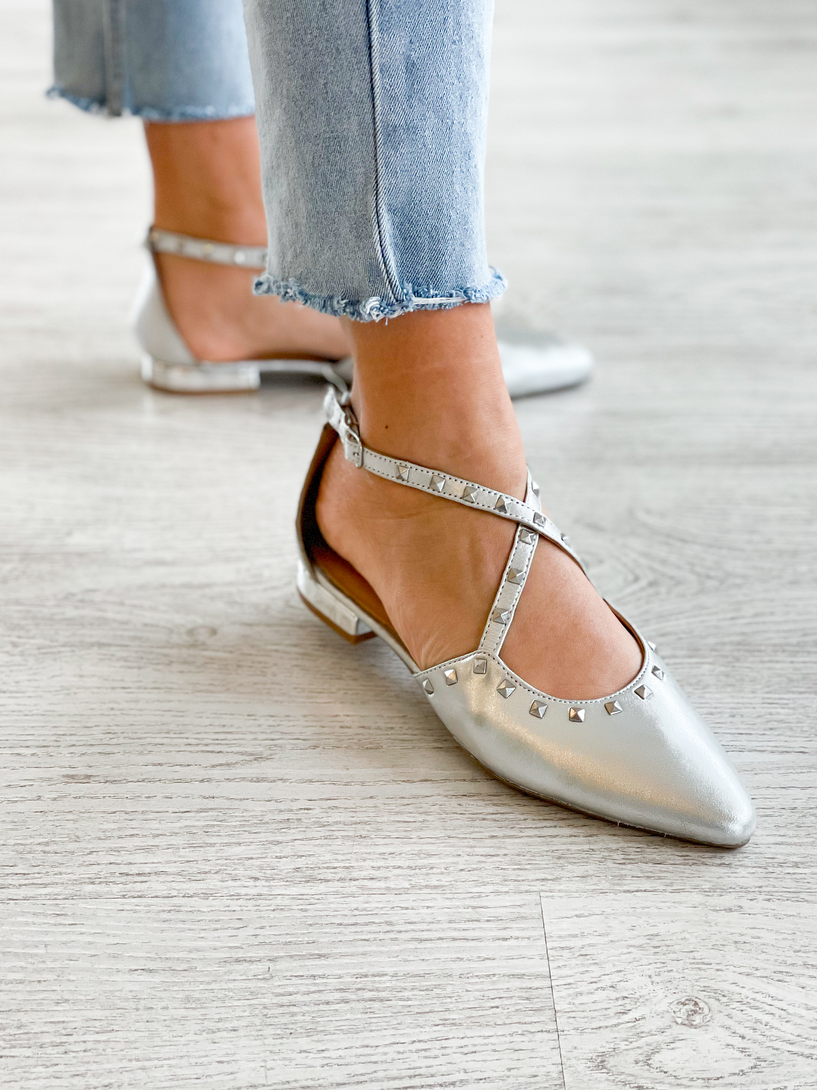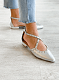 Sapatos de couro prateado com bico fino, tiras e detalhe de tachas. Fechamento ajustável no tornozelo para maior suporte. Forro de couro. Palmilha acolchoada muito confortável de couro.