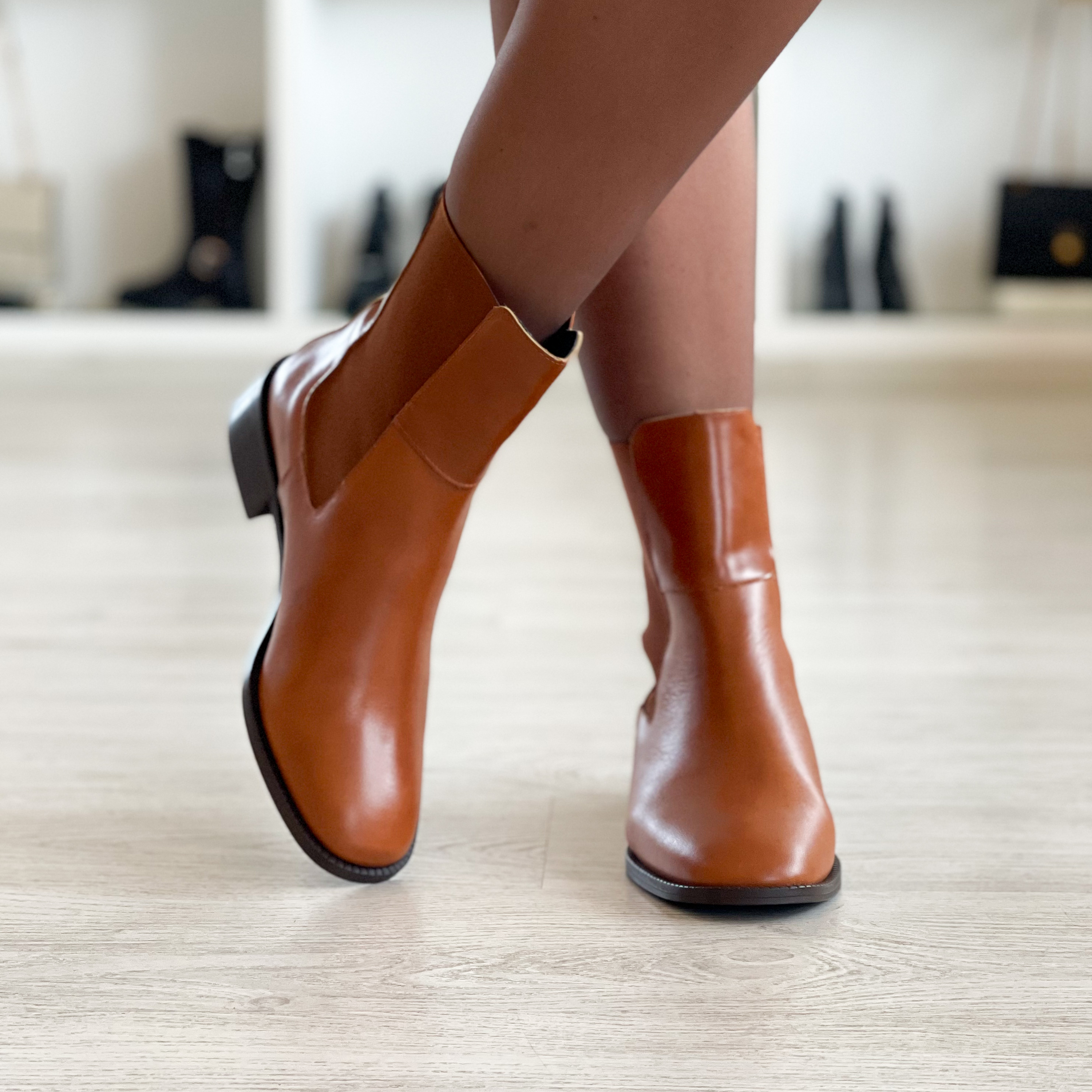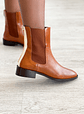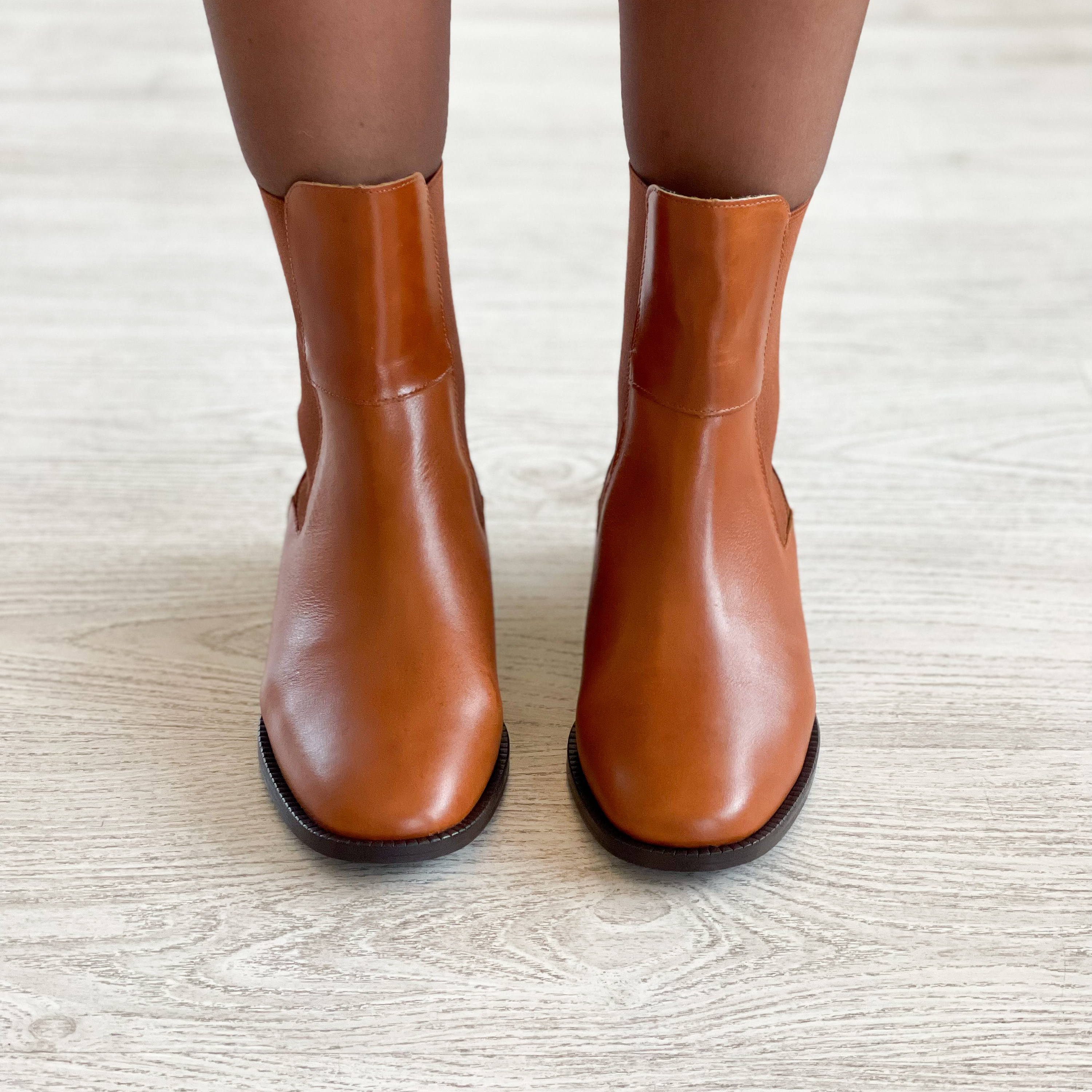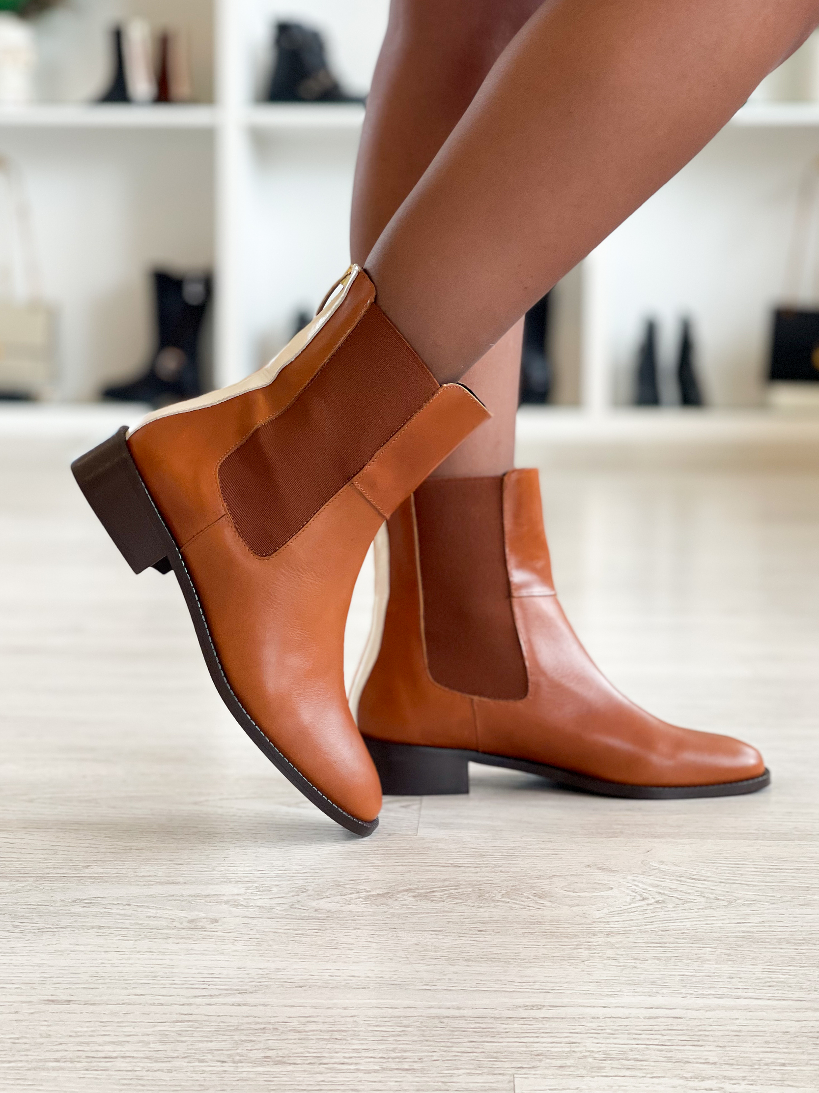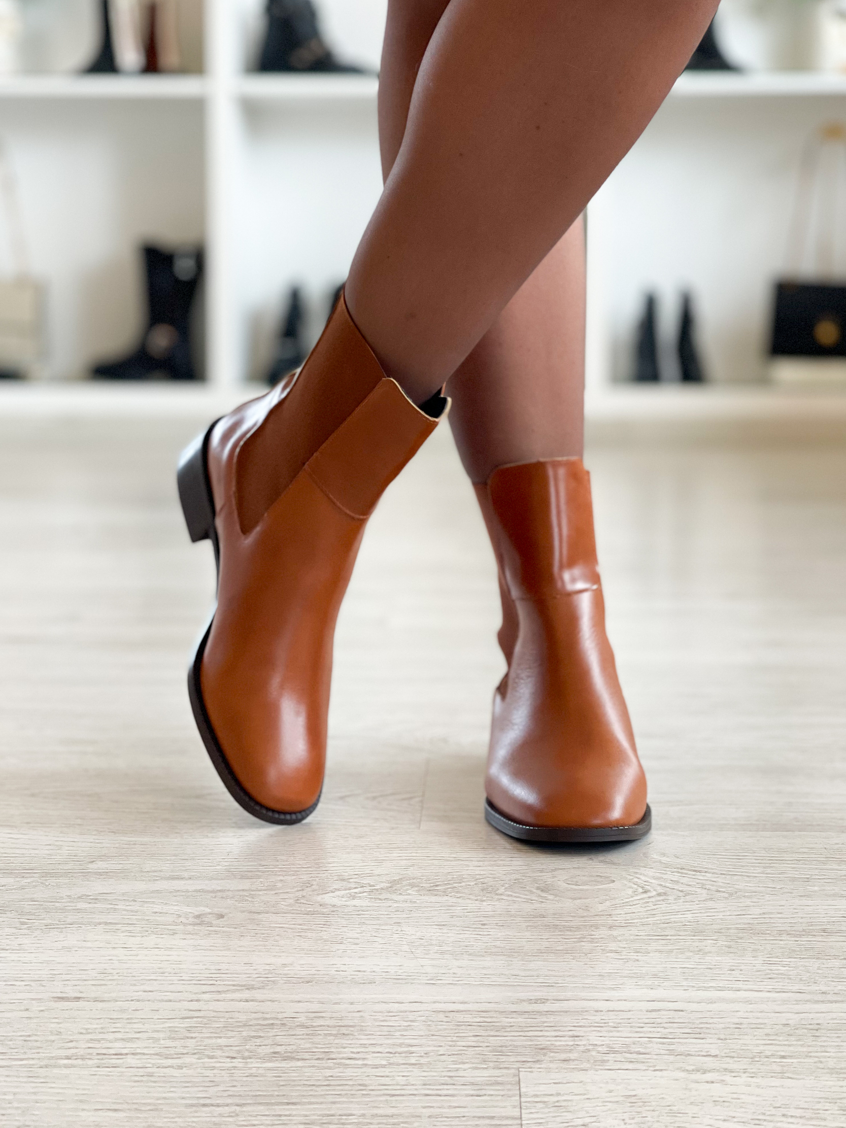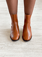 Botas em pele camel forradas em pele com detalhe na traseira e elásticos nas laterais