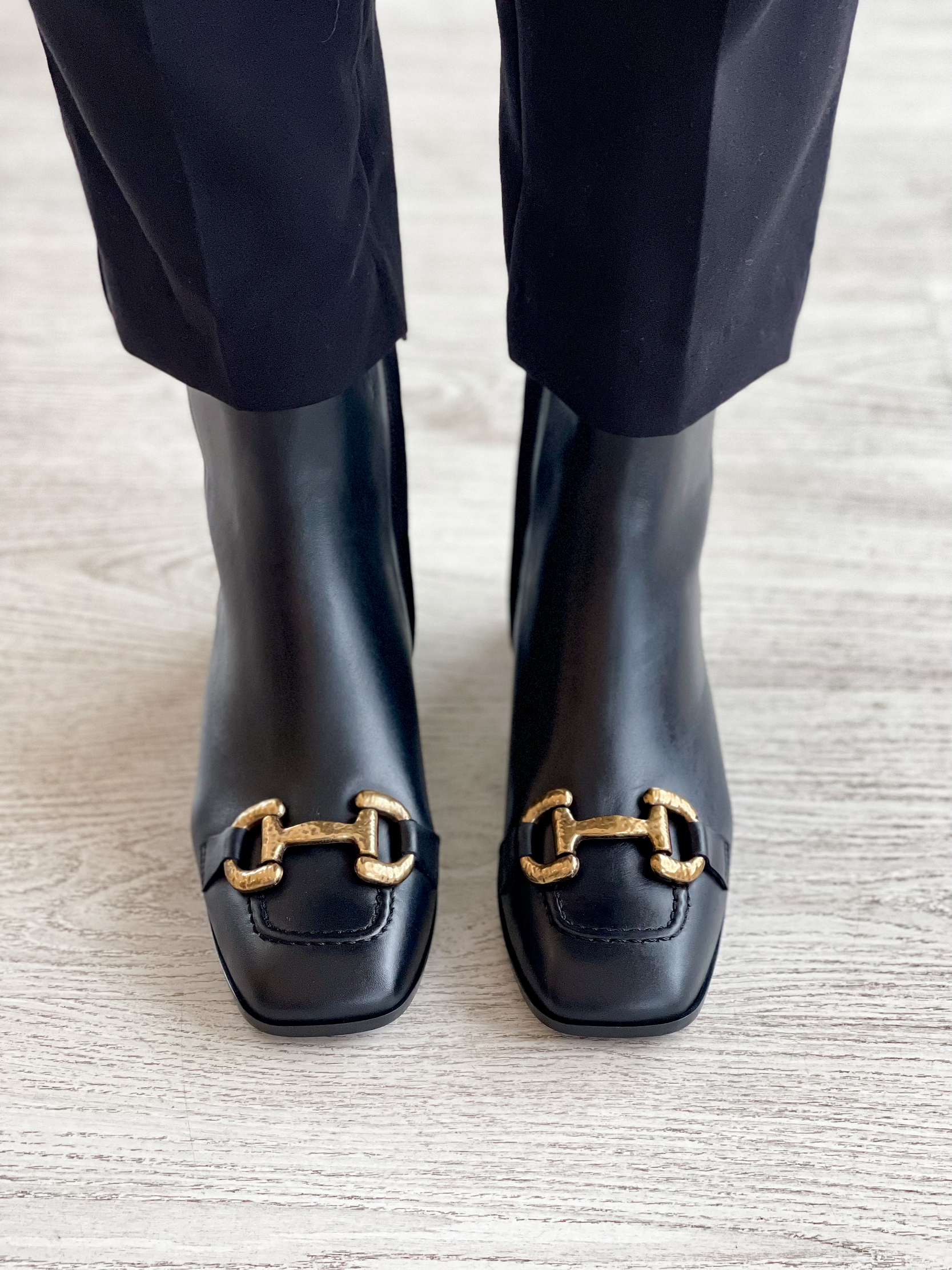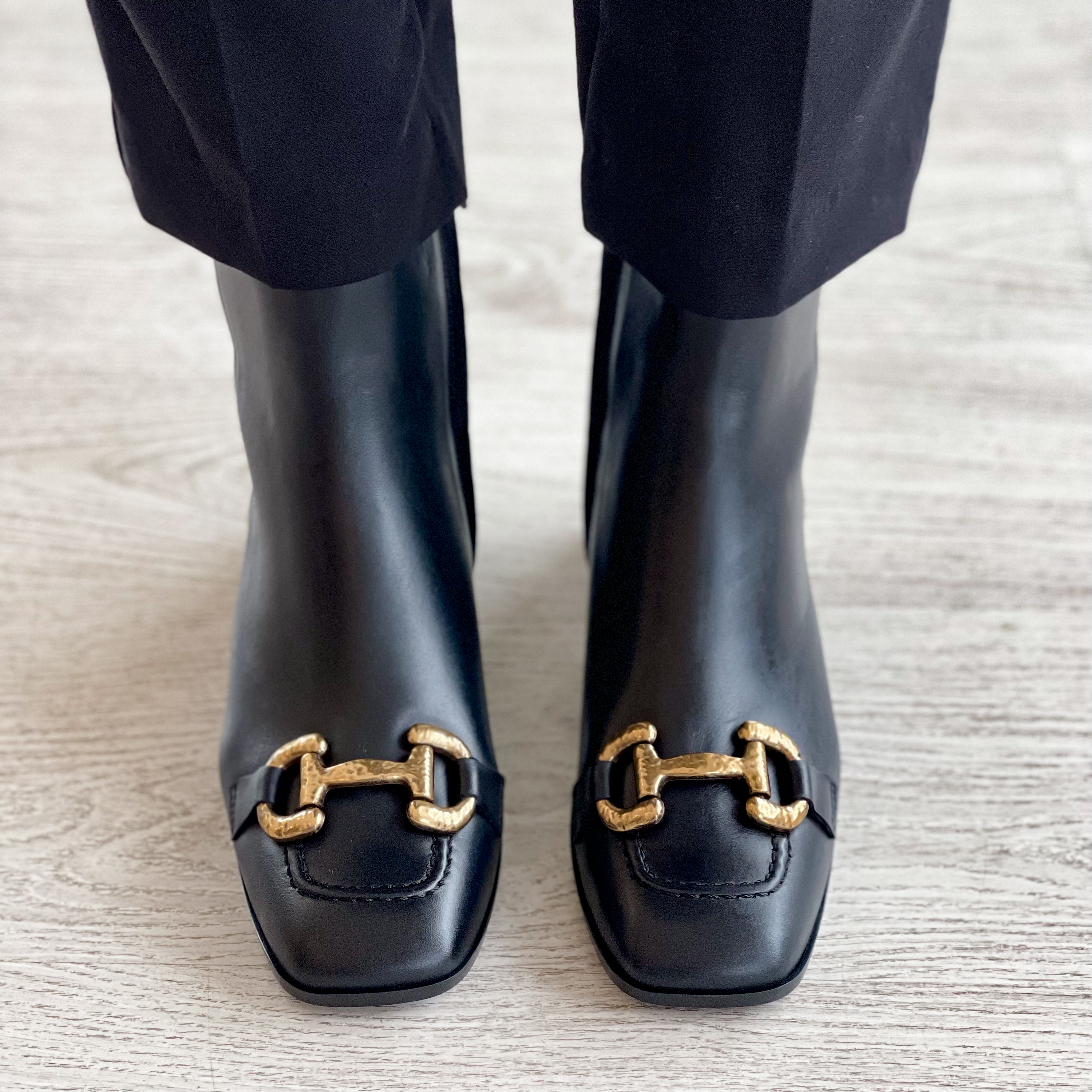 Botas em pele com frente quadrada com cosidos e aplique dourado.